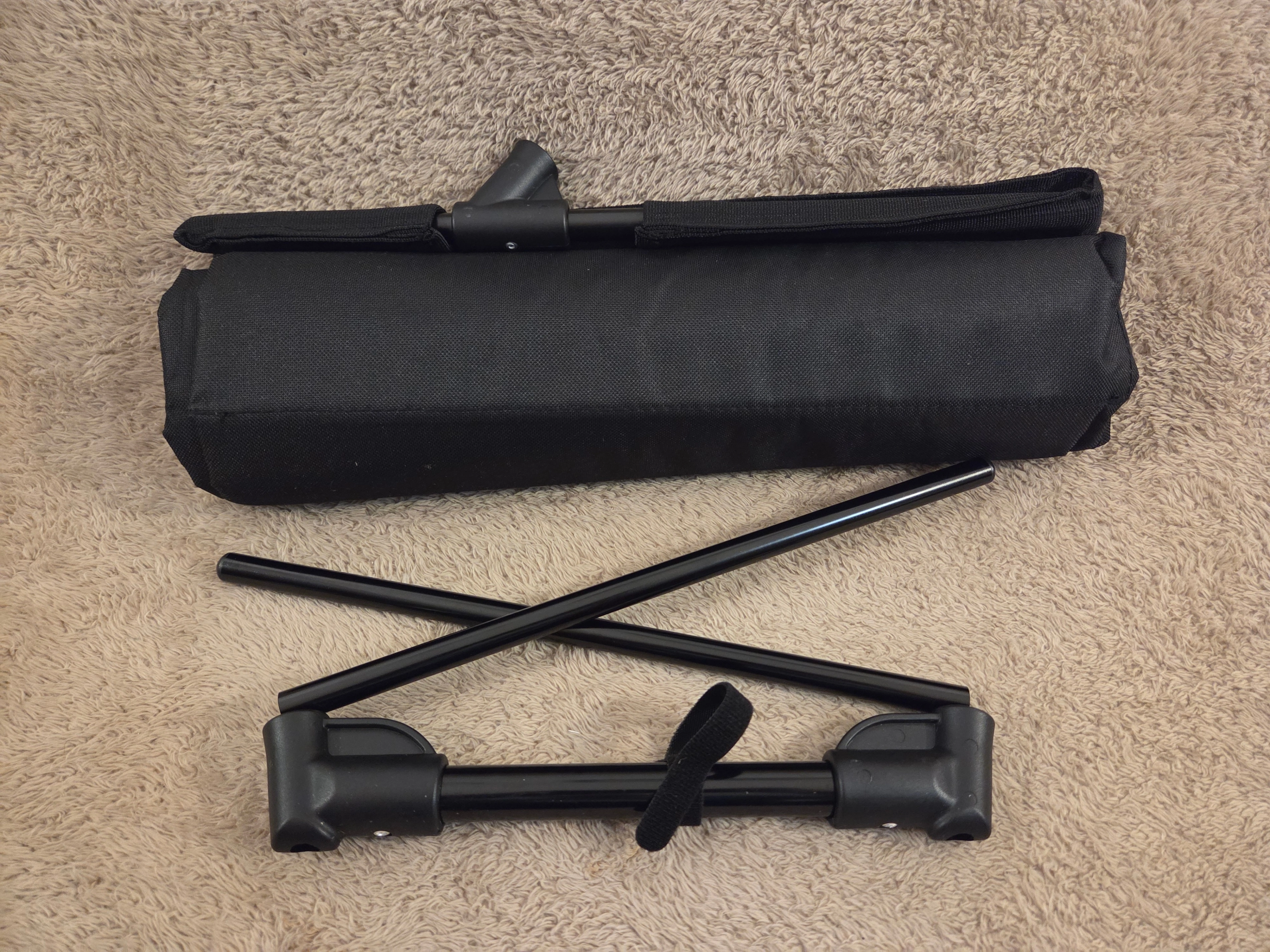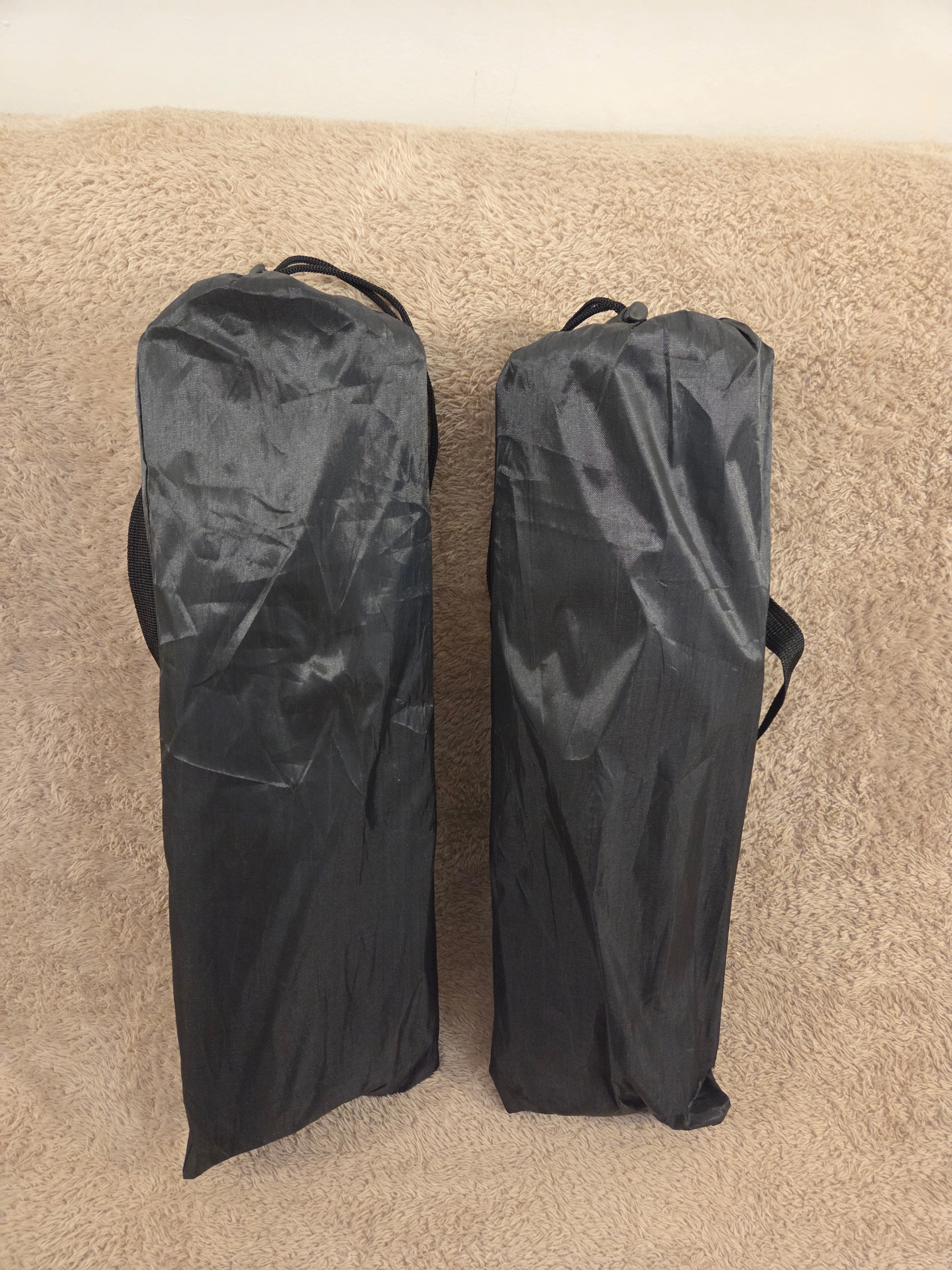 Selling a set of two portable beach floor chairs in black – price is for both chairs together. Quick to set up, comfy to lean back, and each comes with a carry bag for easy transport.