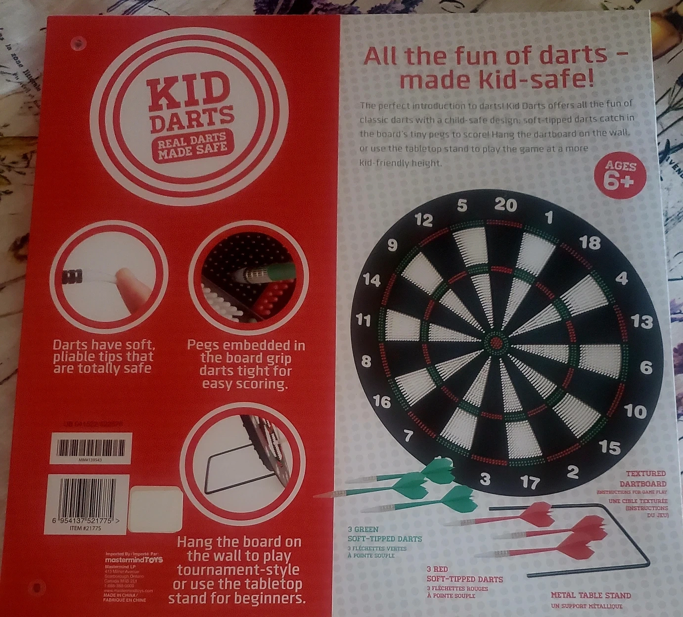 This Kid Darts set from Mastermind Toys is perfect for introducing kids to the game of darts in a safe way! The darts have soft, pliable tips, and the plastic-tipped darts grip the board for accurate shots. You can hang the dartboard on the wall or play tabletop!