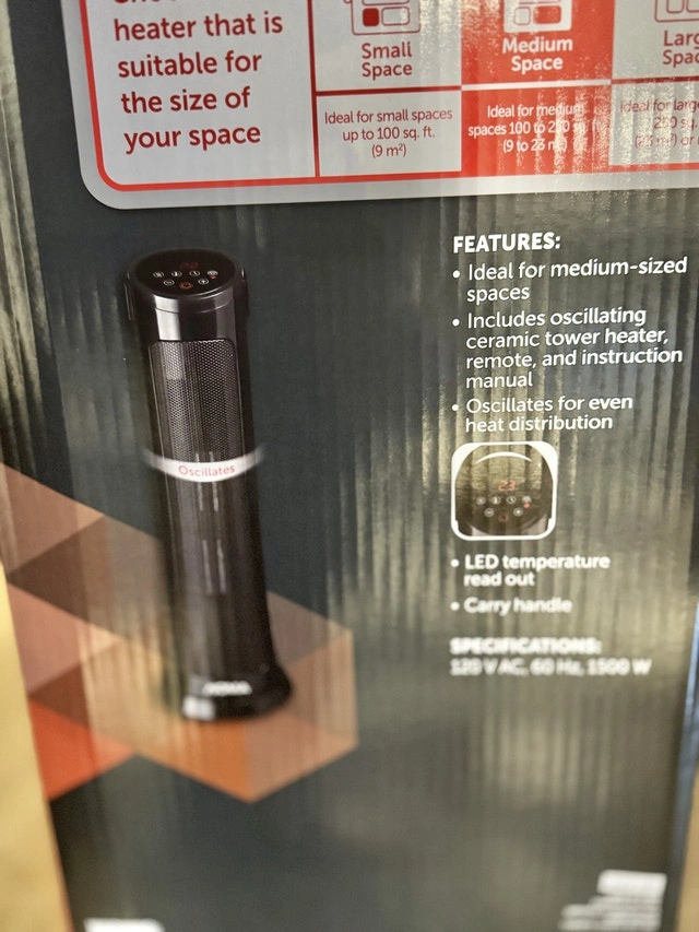 Brand new in unopened box Noma Oscillating Tower Heater. Ceramic Forced Air with adjustable thermostat, 24h timer, room temperature sensor and remote control. 120V, 60 Hz and 1500W. Pick up in Barrhaven near Movati at Strandherd and Woodruff. If ad is up it’s available.