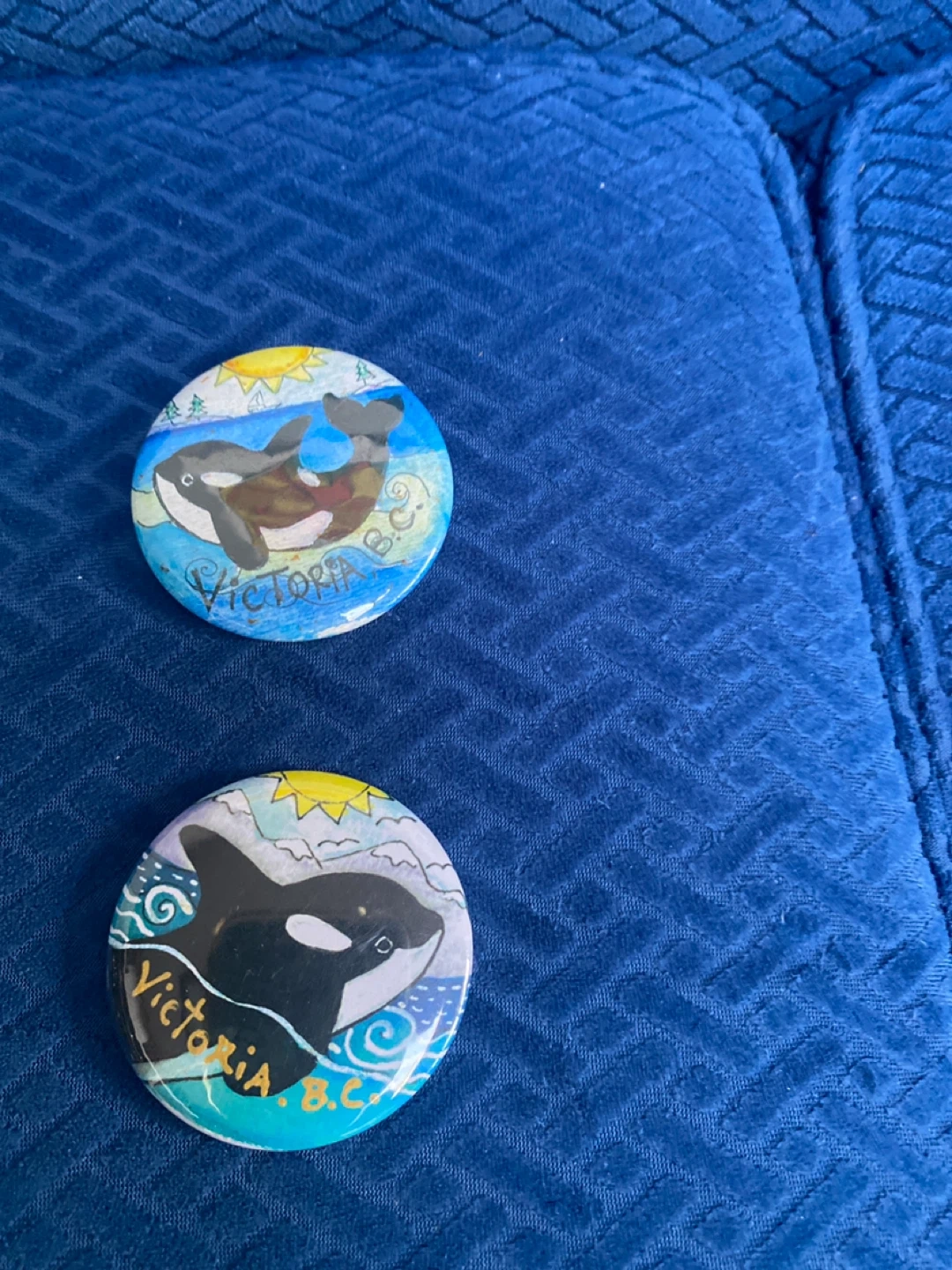 Selling a collection of handmade buttons featuring local animals from Victoria, British Columbia! Each button has a unique design. Great for adding a touch of local charm. These are all magnets.