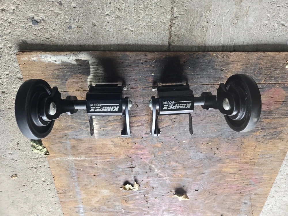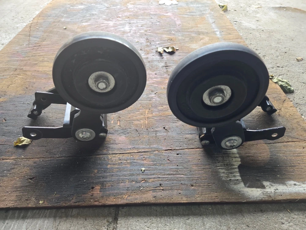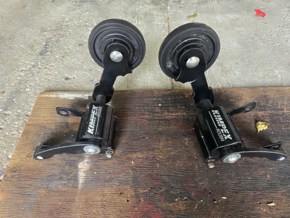 Selling a pair of KIMpex Rouski wheel kits. These are great for adding wheels to your snowmobile skis for easier maneuvering on hard surfaces. They appear to be in good condition and ready to install. Fit "pilot x 5.7". There is no part number on them so I don't know what other skiis they will fit on.