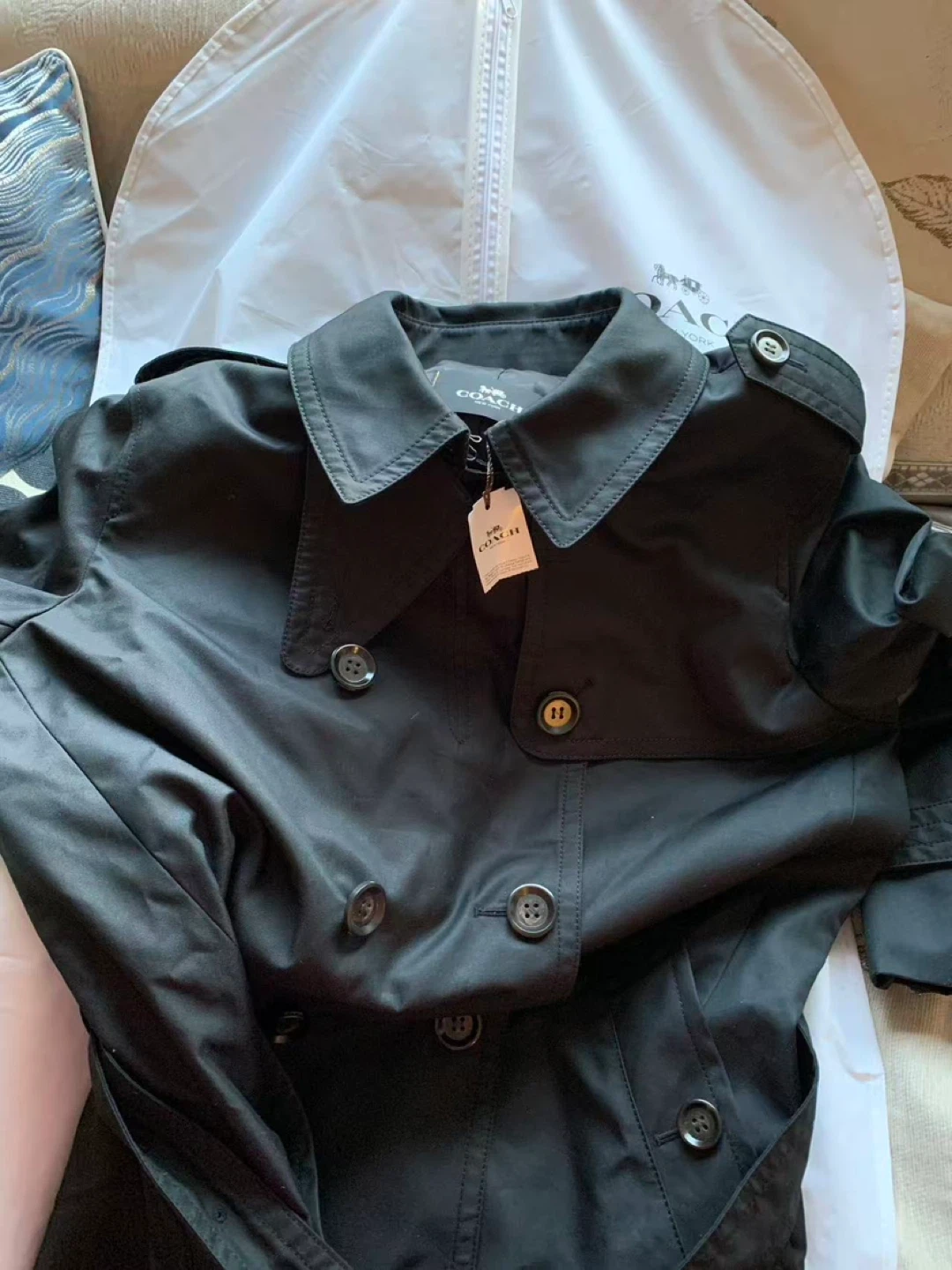 Selling a stylish black trench coat from COACH! It's in great condition and would be a fantastic addition to your wardrobe. The coat features a classic design with a belted waist and button details, perfect for any occasion. Comes with a garment bag for storage!