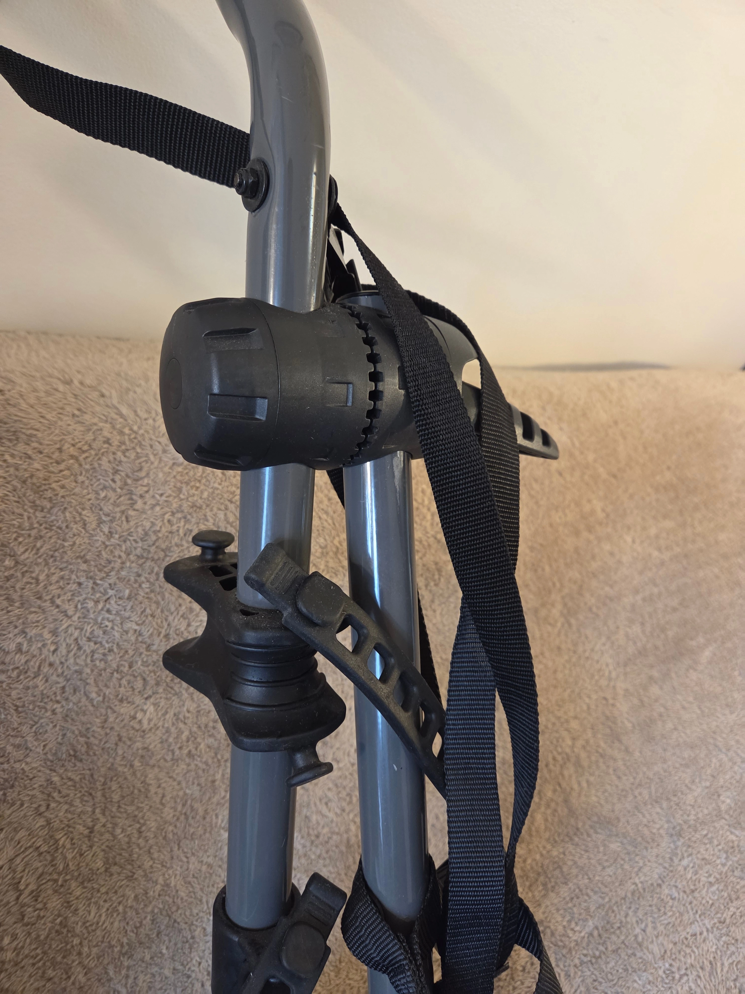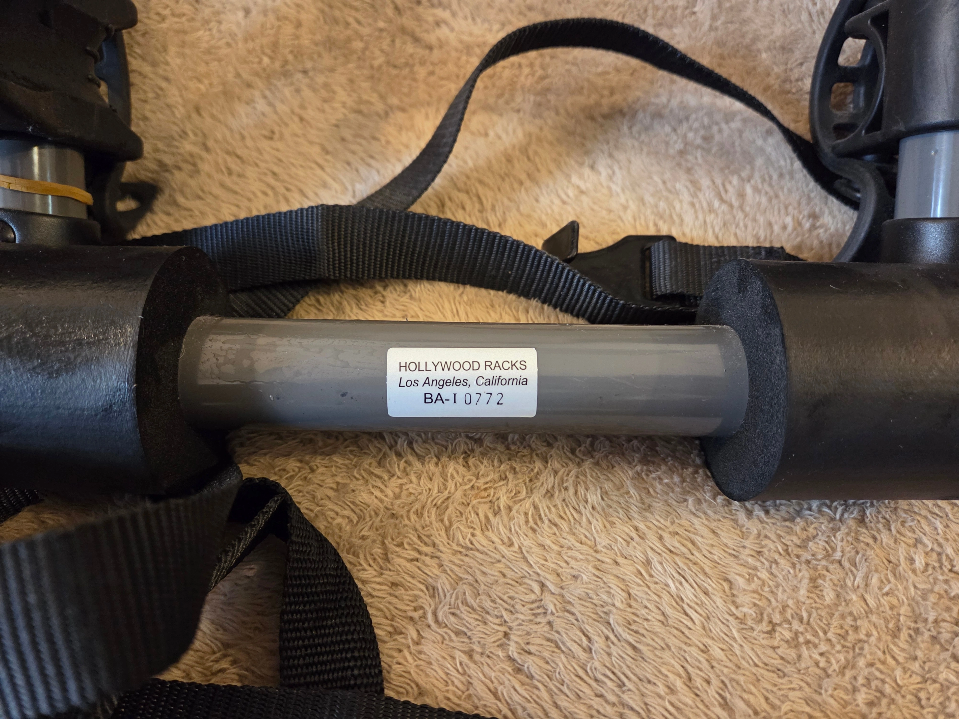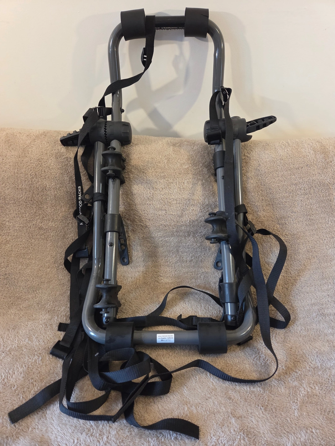 Lightly used Hollywood Racks Baja 2 trunk-mounted bike rack. Carries up to 2 bikes with 35 lb per bike capacity. Quick-release micro-adjust hubs make it easy to set the right angle for your trunk or hatch. Six attachment straps with cam buckles, soft rubber cradles and anti-sway blocks keep bikes separated and stable. Integrated tie-down strap included. Folds flat for storage. Distance between support arms: 29.2 cm (11.5 in). Not intended for e-bikes. Fits many sedans, hatchbacks and SUVs – please check your vehicle in the Hollywood Racks Fit Guide before buying.