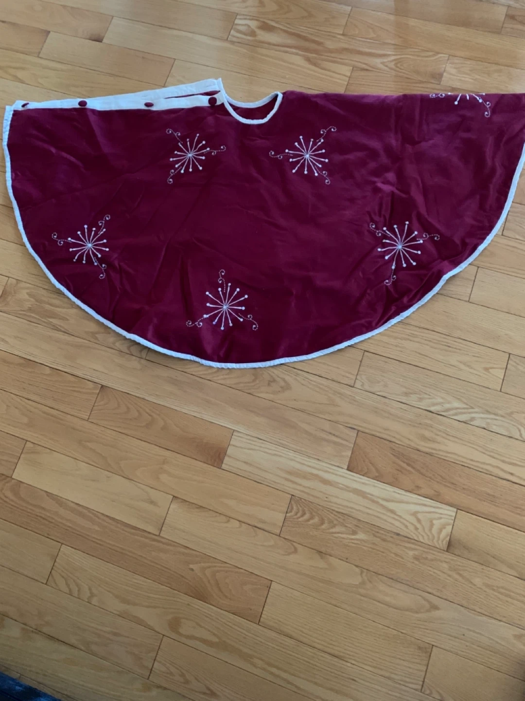 Selling a burgundy Christmas tree skirt with white trim and snowflake designs. It's in great condition and ready to add a festive touch to your holiday decor!