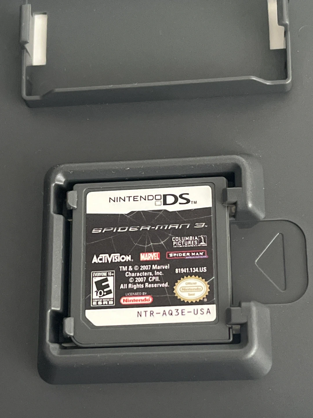 Like new! Selling Spider-Man 3 for the Nintendo DS! This game is rated E for Everyone 10+ and features cartoon violence. It includes the original case and instruction booklet. Get ready to explore a massive open city world and master the power of Black-Suited Spider-Man!