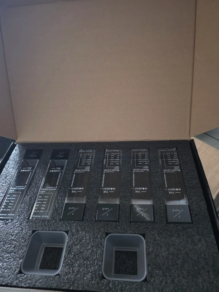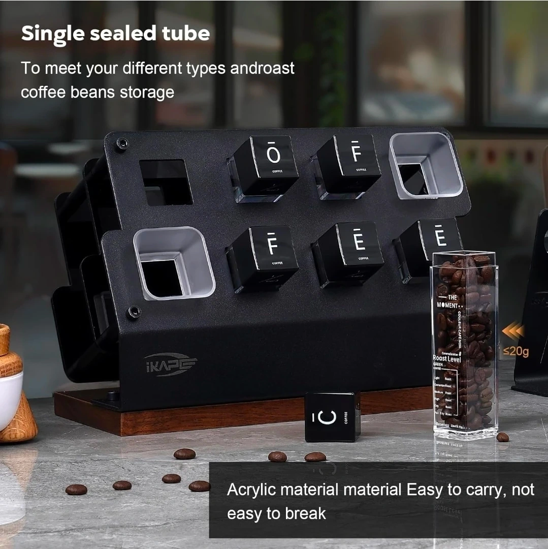 This is an IKAPE coffee bean storage container with a metal display stand and walnut base. It comes with 6 ace tubes and 2 hoppers. It has an acrylic material that is easy to carry and not easy to break. Brand new!!!