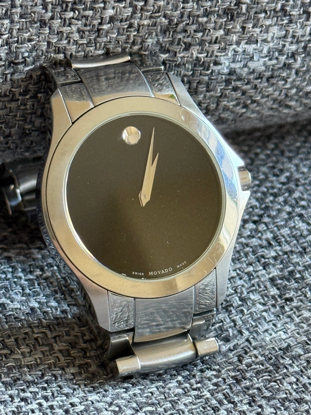 Selling a Movado Swiss Made watch. It's a classic timepiece with a sleek design. The watch has a silver band and a minimalist black face. Feel free to message me if you're interested!