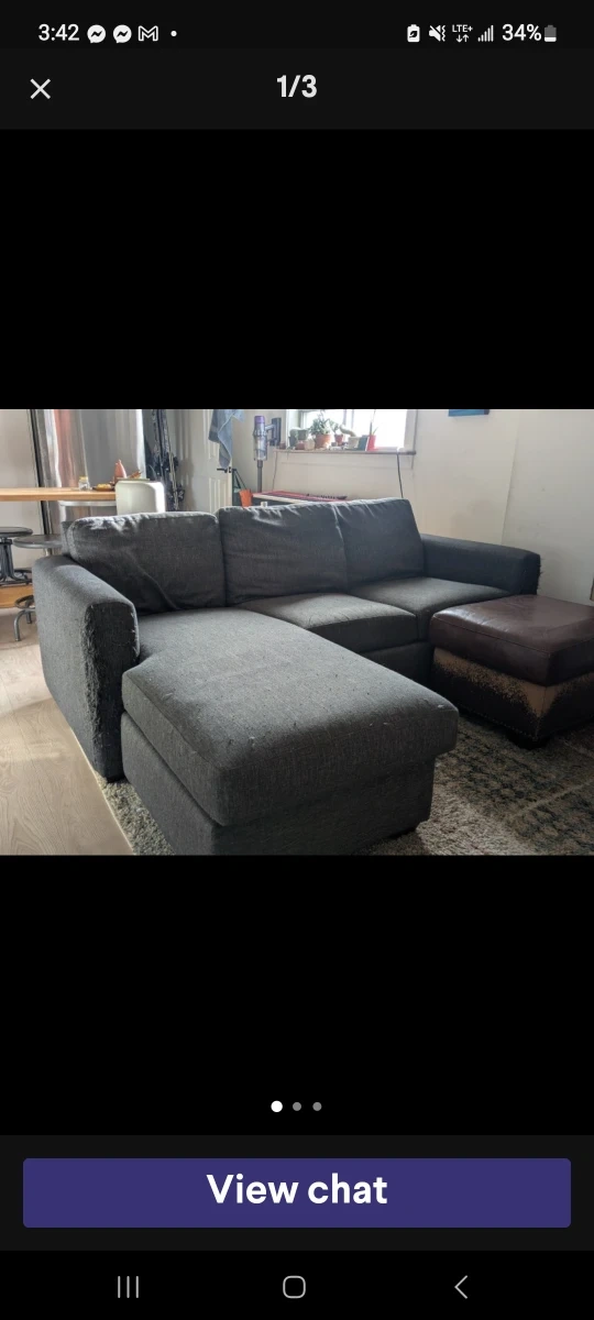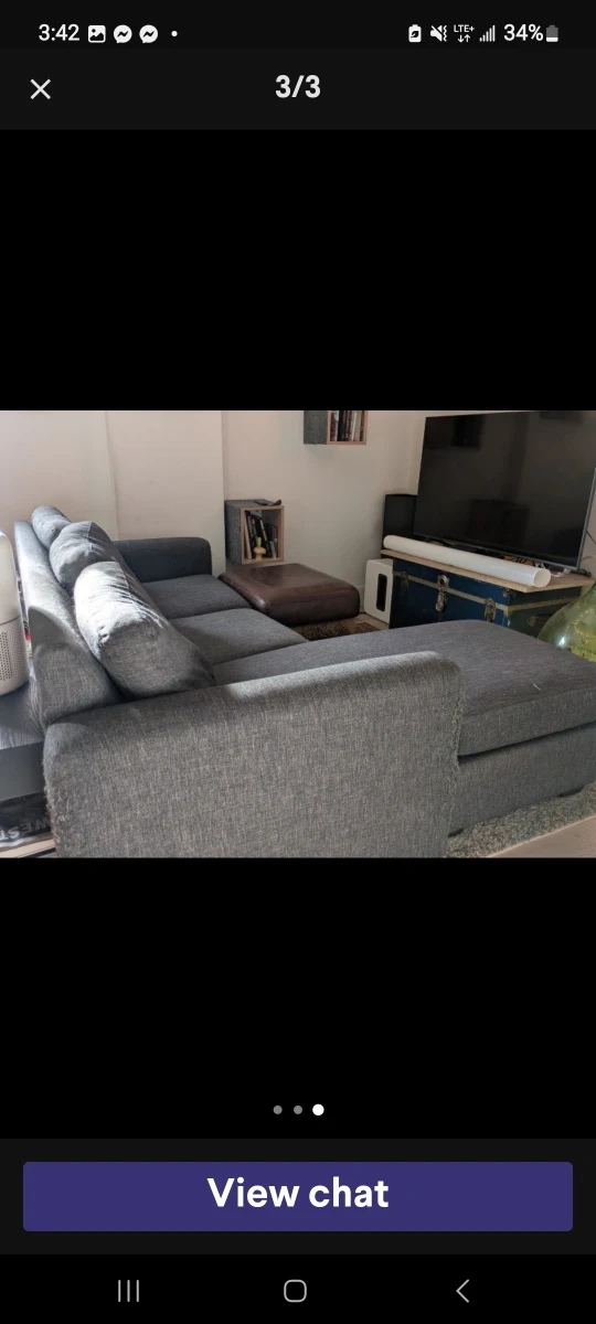 Selling a comfy grey sectional sofa, The strands of fabric can be cut off. Damage is the same on each arm rest (left and right side). Apart from that the couch is in good condition. Please note there is some wear and tear on the corner as shown in the last photo.