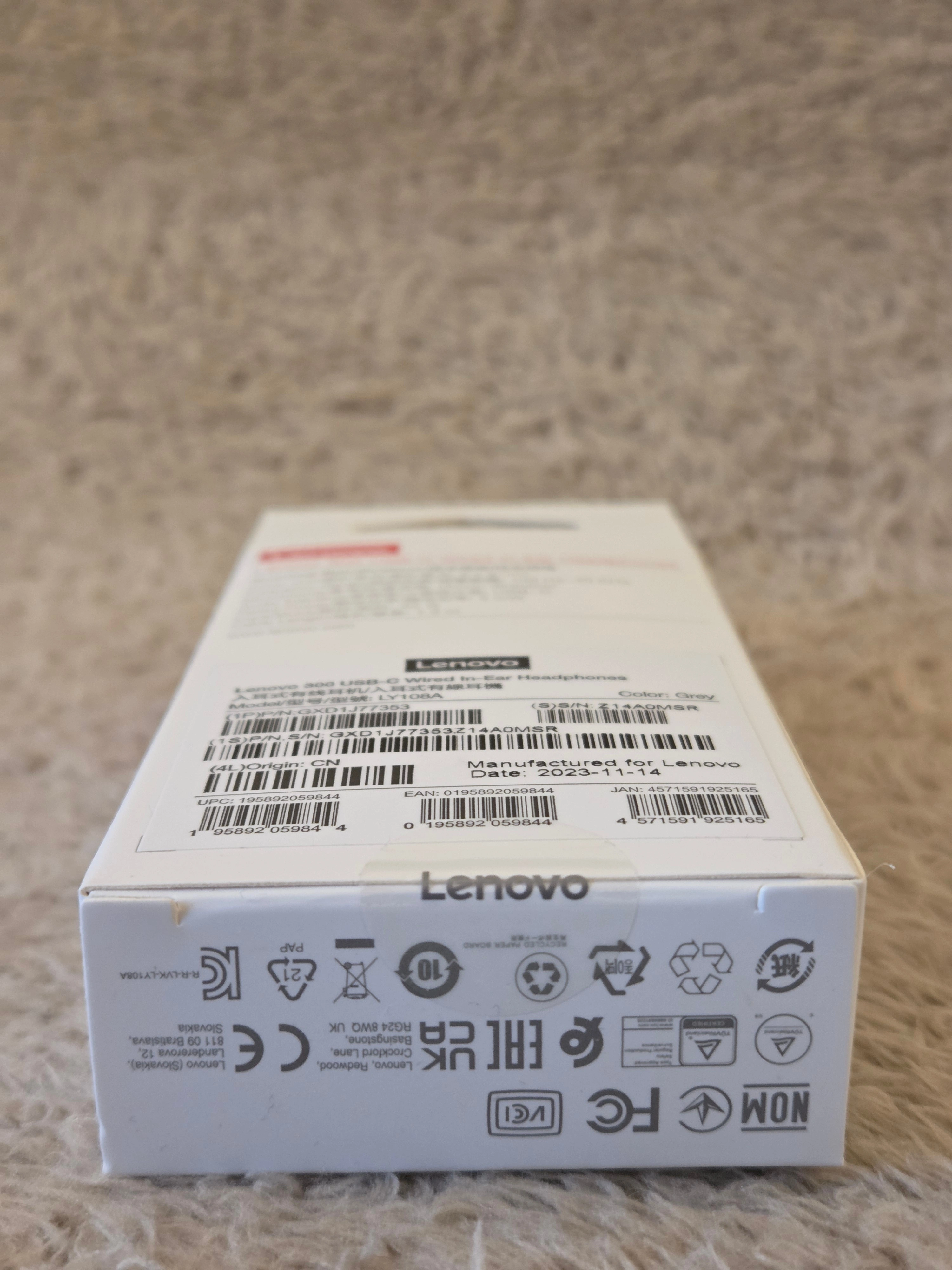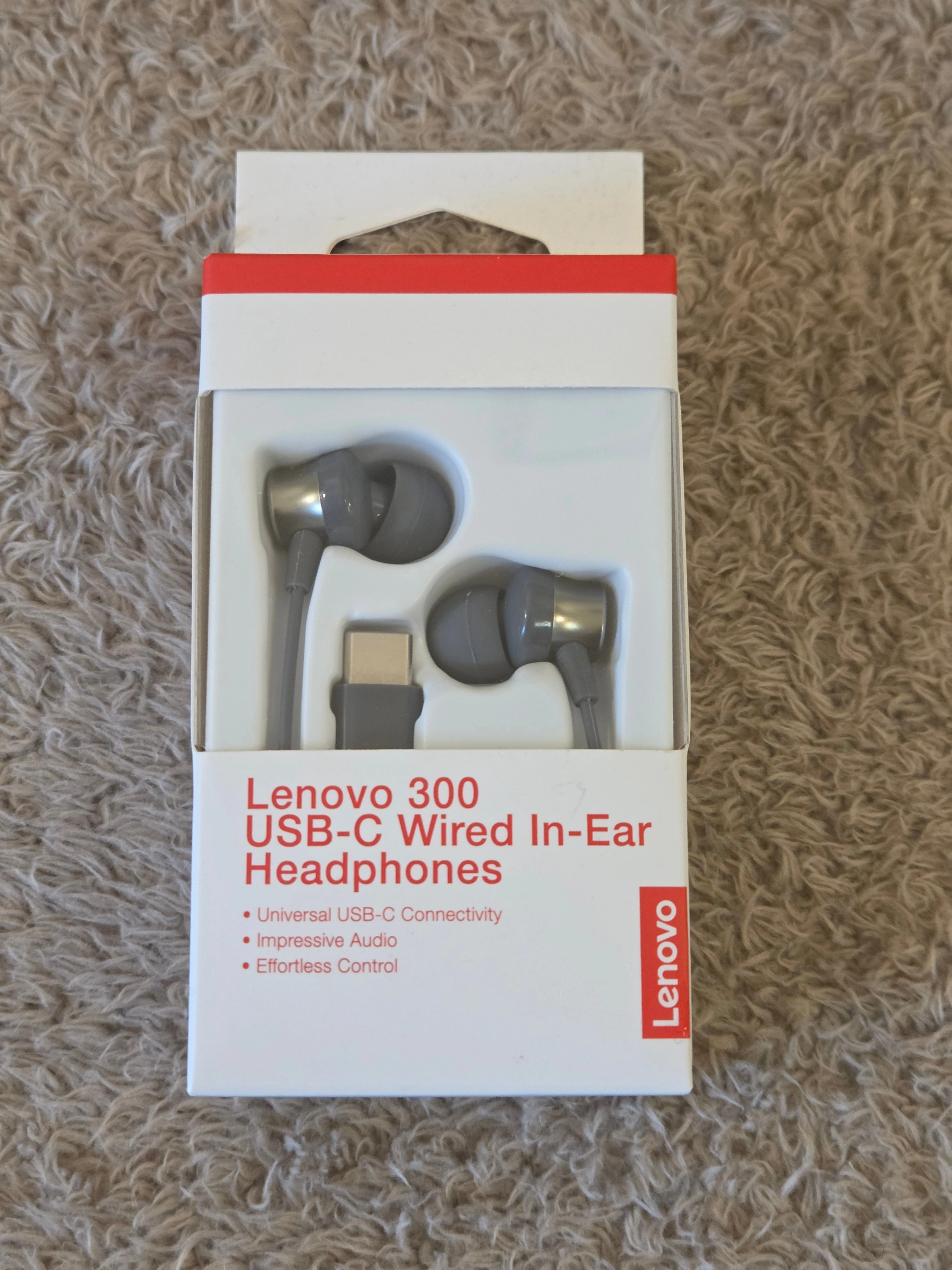 New, sealed Lenovo 300 USB-C in-ear headphones in Grey. Simple, reliable wired buds for calls, video meetings and music. USB-C plug works with most modern phones, tablets and laptops that support digital USB-C audio (Pixel, Samsung, newer iPad and many notebooks).