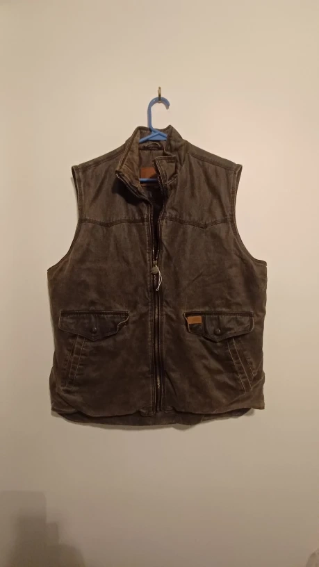 Here's a Vintage Outback Oilskin Vest Weatherproof & Broken-In! It's a size Large and has a unique, rugged look. Perfect for adding a bit of western flair to your wardrobe.