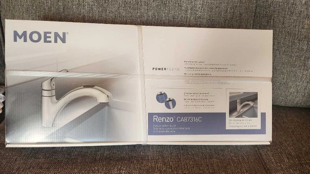 Upgrade your kitchen with this brand new Moen Renzo single-handle pull-out kitchen faucet in chrome, model number CA87316C. Still in its original packaging, this faucet combines sleek design with reliable functionality. The pull-out feature offers added convenience for all your kitchen tasks, and the chrome finish ensures it will look great in any kitchen setting. Here are some of the features: