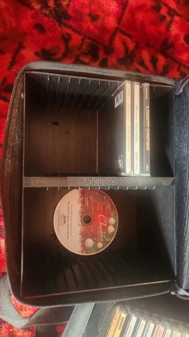 I'm selling a collection of various music CDs, all housed in a convenient carrying case. These CDs are from a variety of genres and artists, perfect for expanding your music library or reliving some classics. They are in used condition, ready to bring you hours of listening pleasure.