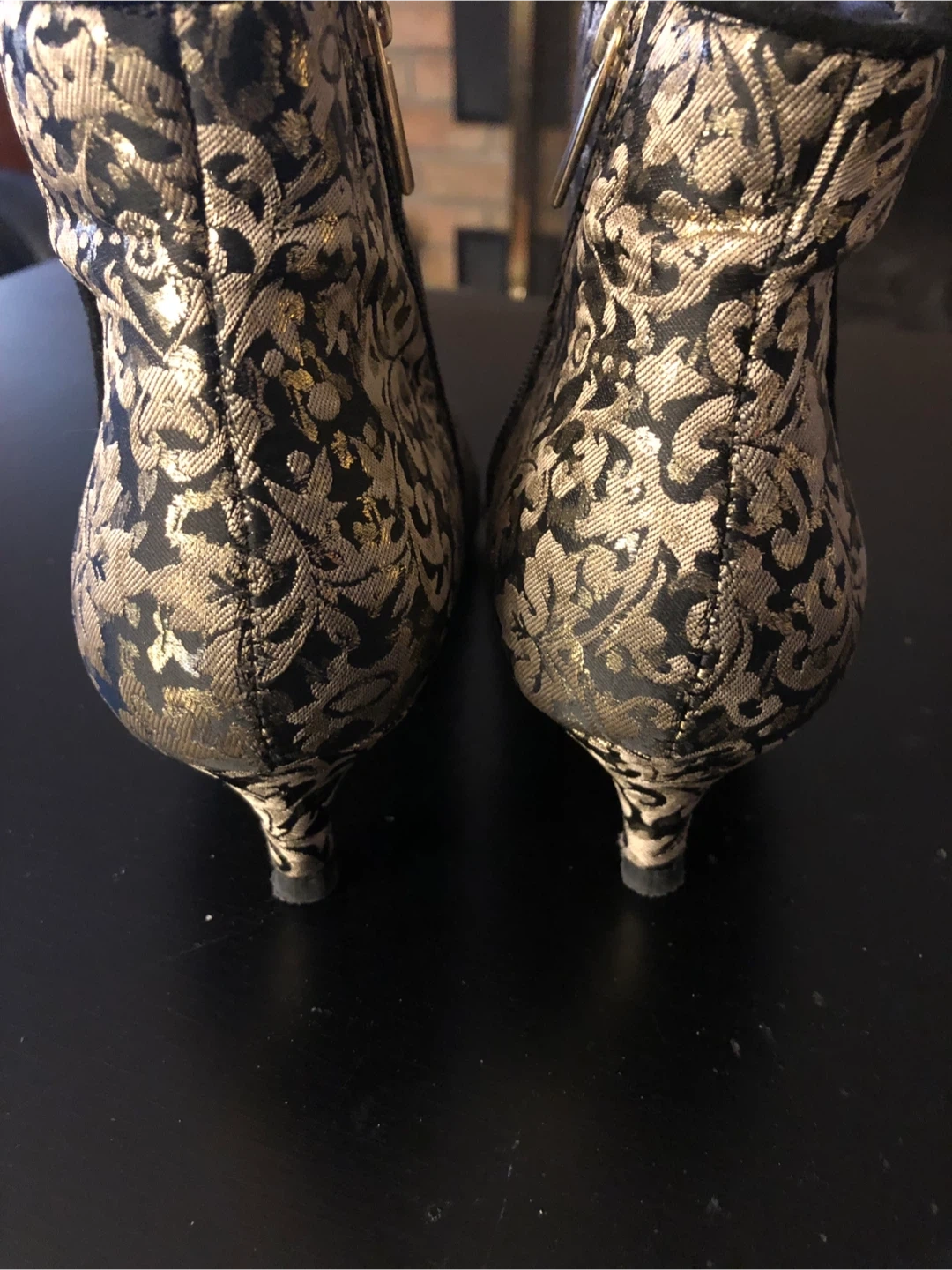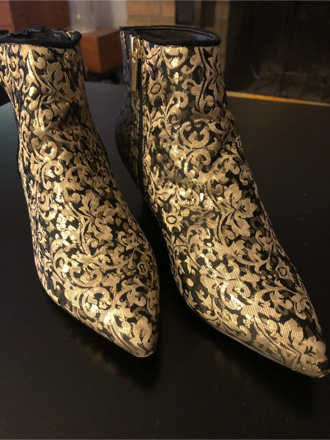 Perfect party shoes!! These ankle boots feature a unique gold and black brocade pattern. They have a low kitten heel and a side zipper for easy wear.