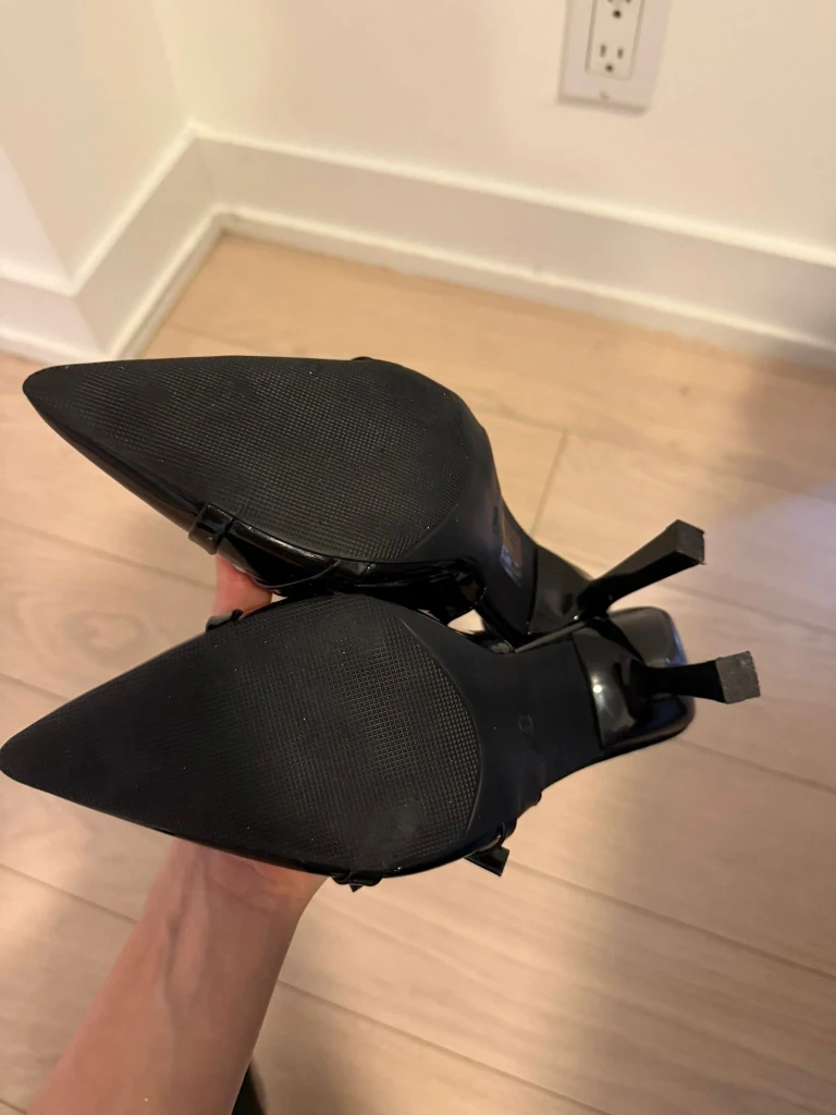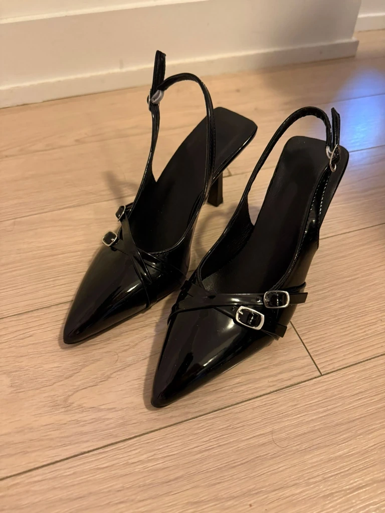 These are a pair of black slingback heels. They feature a pointed toe and a unique strap design with silver buckles. They appear to be in good condition, perfect for adding a touch of elegance to any outfit!