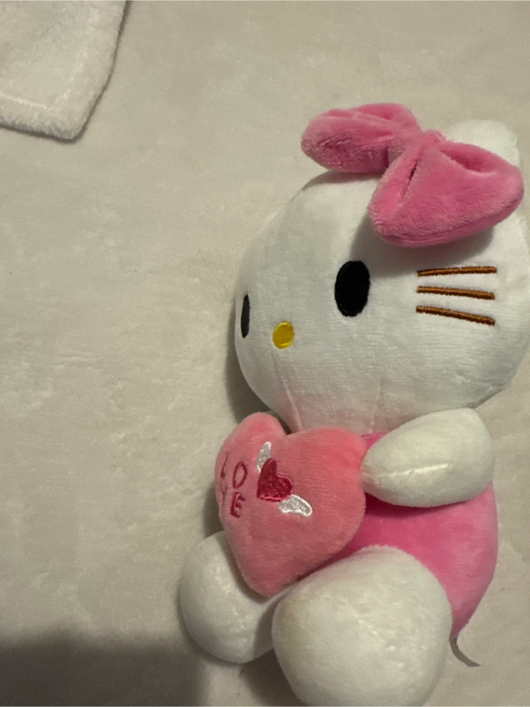 Selling a cute Hello Kitty plush toy! It's in great condition and features Hello Kitty holding a pink heart with 'Love' embroidered on it. Perfect for any Hello Kitty fan!