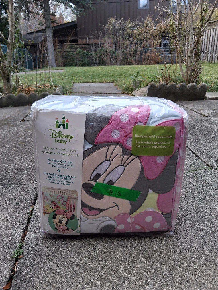 Selling a brand new Disney Baby 3-Piece Crib Set! It includes a comforter, fitted sheet, and crib dust ruffle. Bumper is sold separately. I bought this for $15.