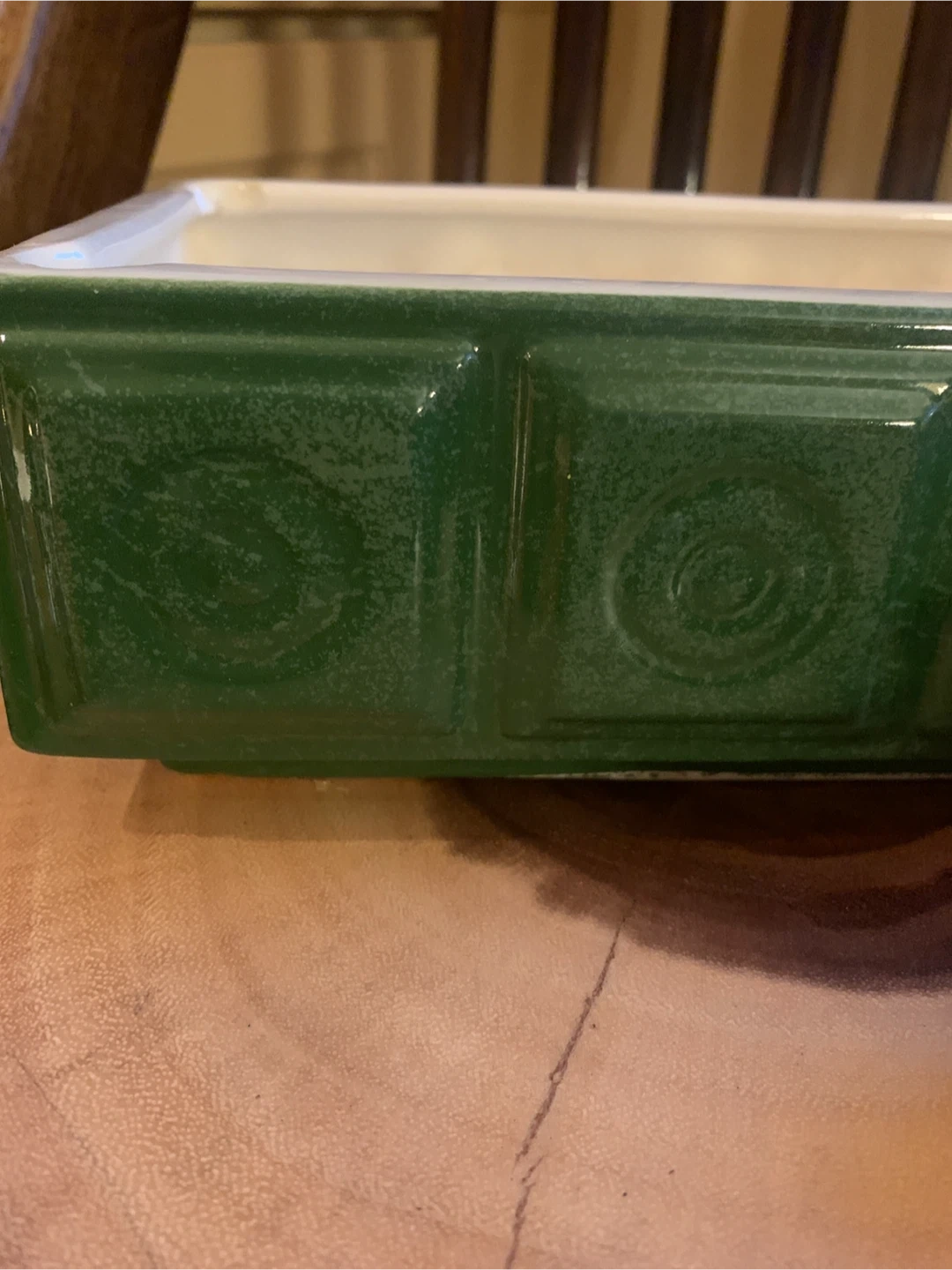 Selling a vintage MCM green glazed planter! It has a lovely geometric box design with spirals in it. It's in good shape with some wear to the inside from soil and one tiny red mark on one spiral. This planter would be perfect for succulents or a festive display of pine cones, berries and greenery! A lovely addition to any home or a garden. A beautiful shade of green! Cash only please. Props not included.