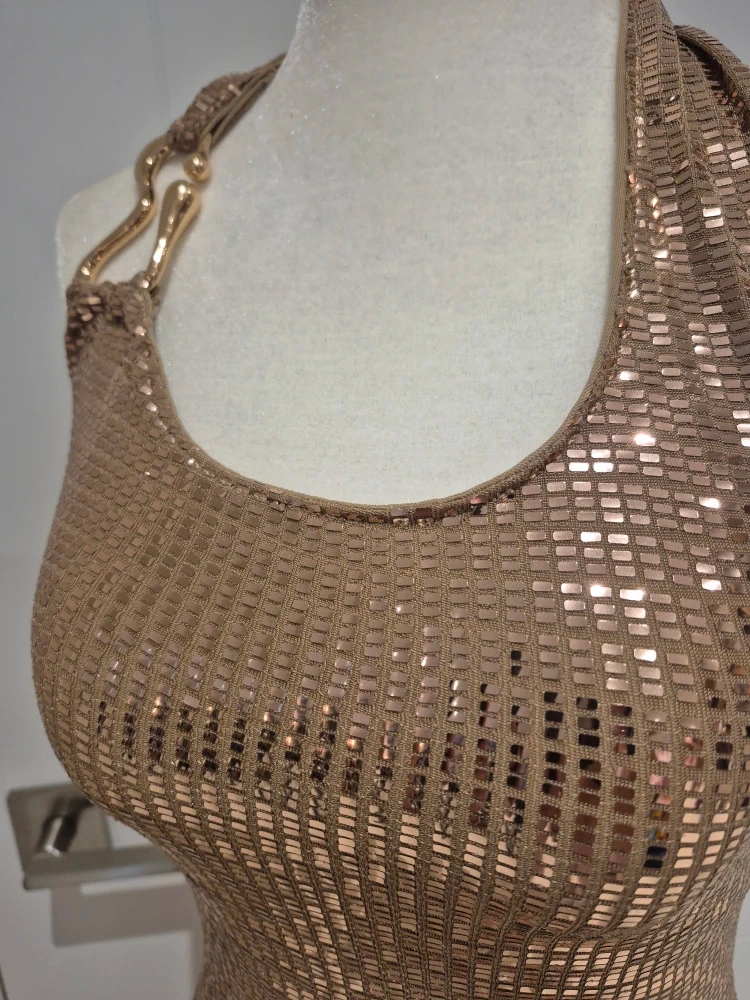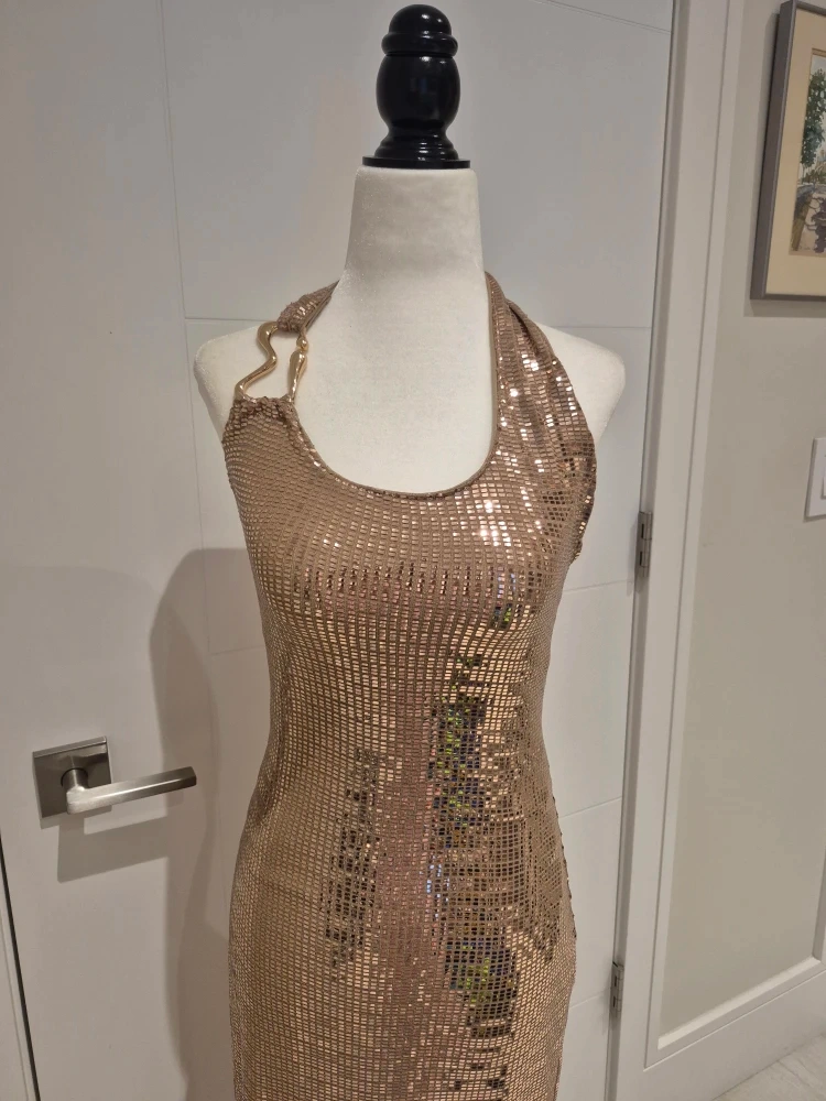 Gorgeous sequin halter maxi dress in a beautiful gold colour! Perfect for a night out or a special occasion. It's in great condition and ready for a new home. Worn once for New Year's Party. The mannequin is a size small, it looks a bit tight from the photo but it fits an XS.