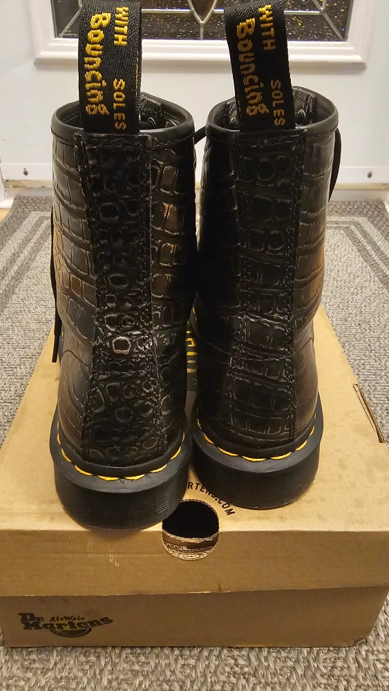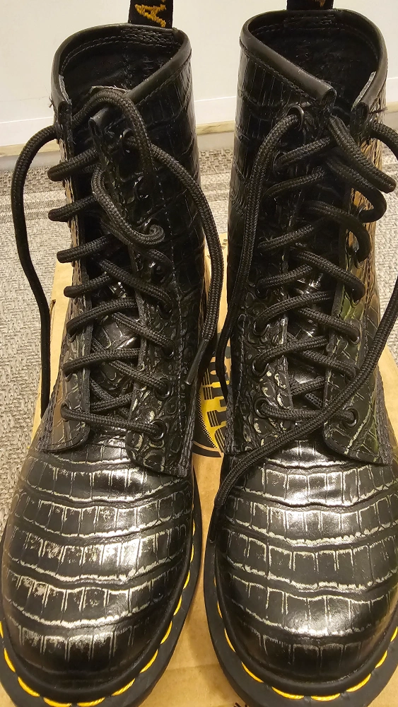 Selling a pair of Dr. Martens 1460 W boots in Gunmetal Wild Croc Emboss! These are a women's size US 6 and come with the original box. Barely worn. They're in great shape and ready for a new home.