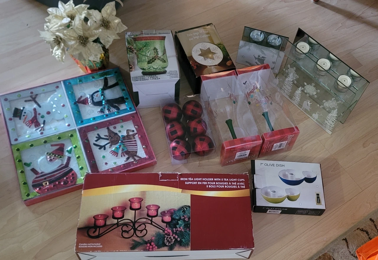 I have a variety of home decor items available. They include candle holders, olive dishes, and decorative ornaments. Perfect for adding a touch of charm to any room in your home everything for $40