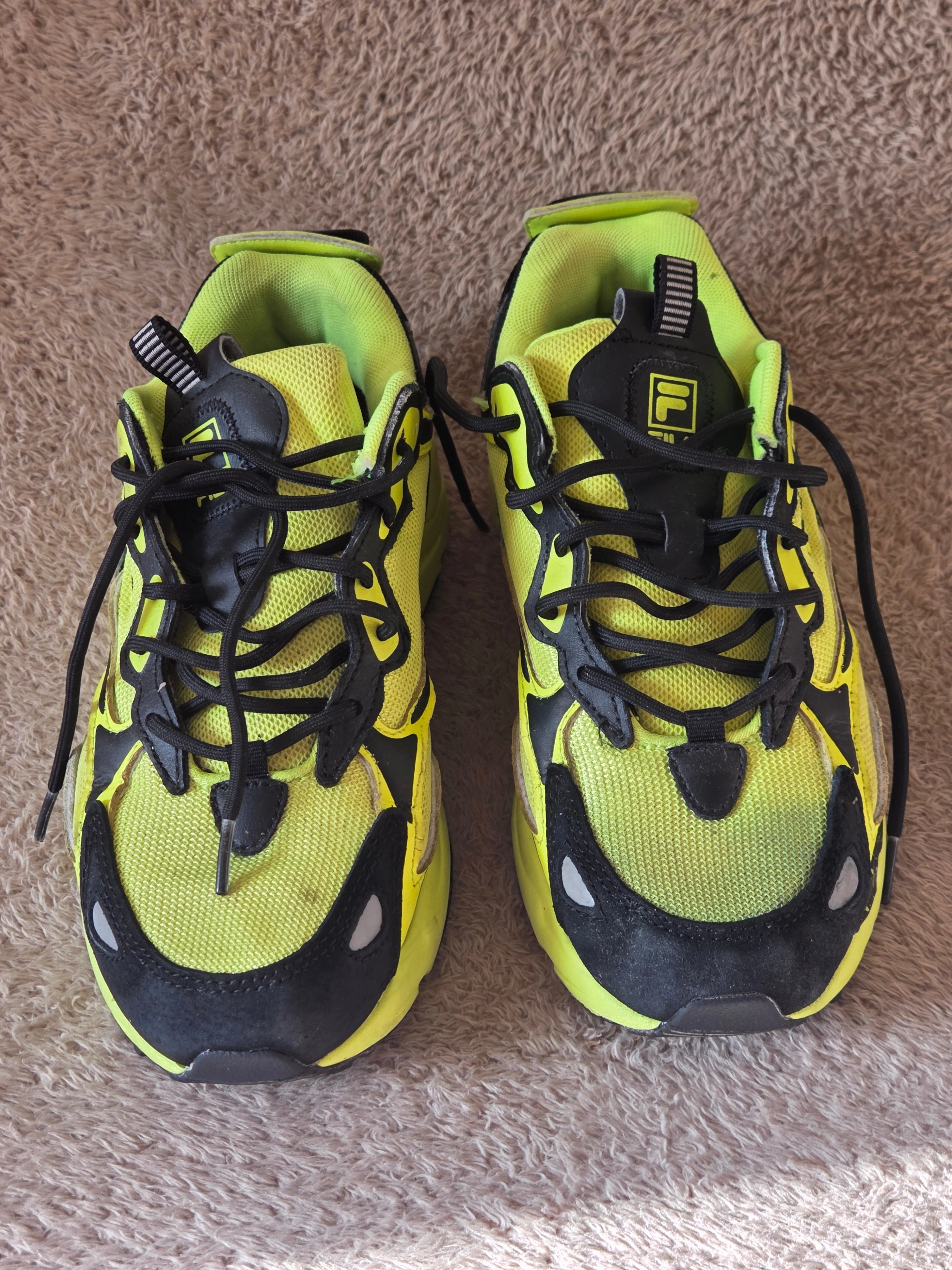 Bright and bold FILA chunky sneakers in Men’s US 8 (EU 41, UK 7, approx insole 26 cm / 10.2 in). Neon yellow with black overlays and reflective details – great visibility and a true 90s street look.