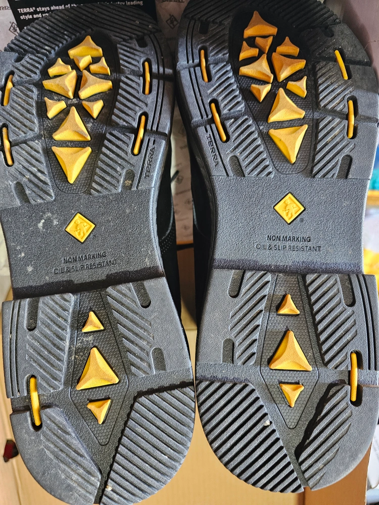 Terra Patton 6-inch work boots in black, size 12. These boots feature an aluminum safety toe and are oil and slip resistant. They were worn once and come in the original box!
