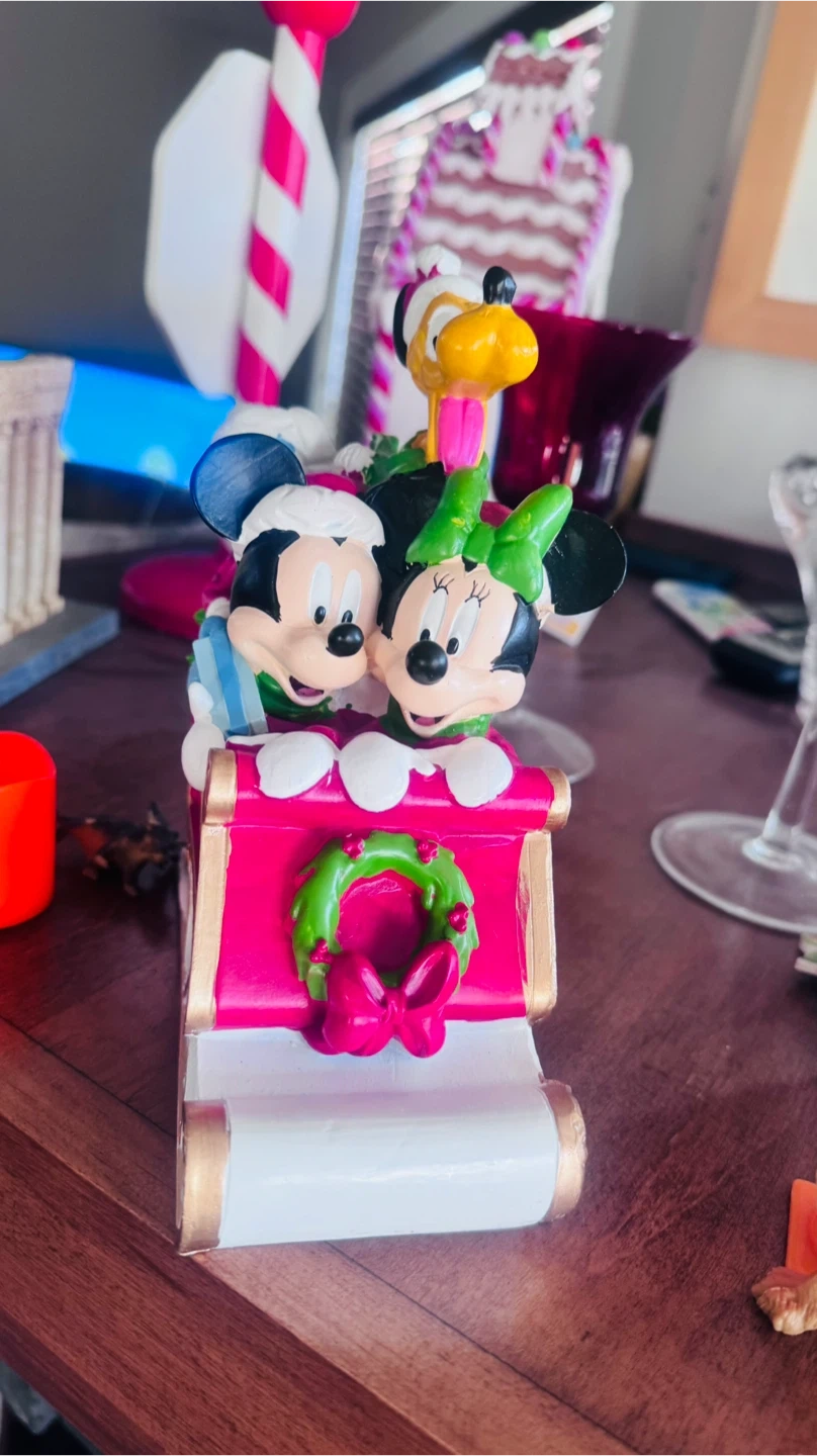 Selling a cute Disney Christmas sleigh figurine featuring Mickey, Minnie, Donald, and Pluto. It's in great condition and perfect for holiday decorating new