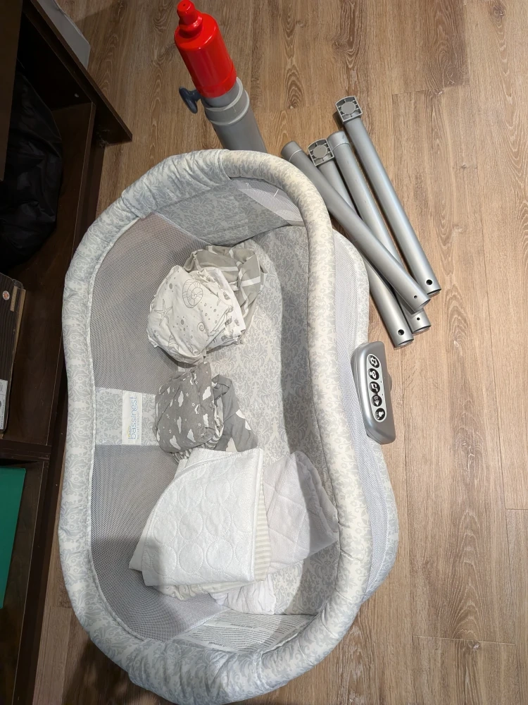 Selling a Halo Bassinest Swivel Sleeper. It's in good condition and ready for a new home. It comes with the base, bassinet, and some fitted sheets. It also has a control panel with soothing sounds and a nightlight to help your baby sleep soundly