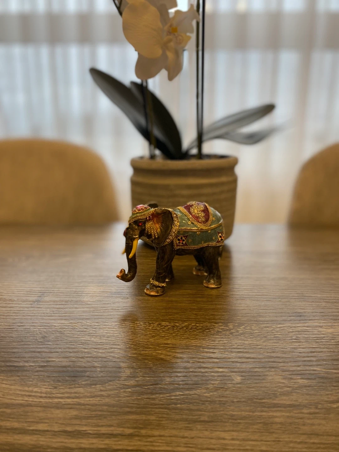 This is a lovely elephant trinket box. It is beautifully decorated and the top opens up to reveal a storage compartment inside. It's perfect for storing small items or as a decorative piece