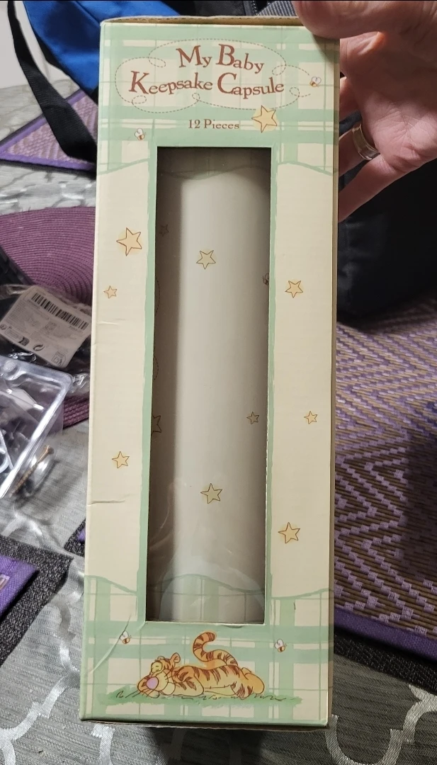 Selling a brand new My Baby Keepsake Capsule, still in its original box! This 12-piece set is perfect for storing baby's precious memories and mementos for a lifetime. It includes a record book to chronicle baby's first year, a family tree chart, photo frames to archive special photos, a fabric storage bag for keepsake envelopes, and closure stickers for sealing the capsule