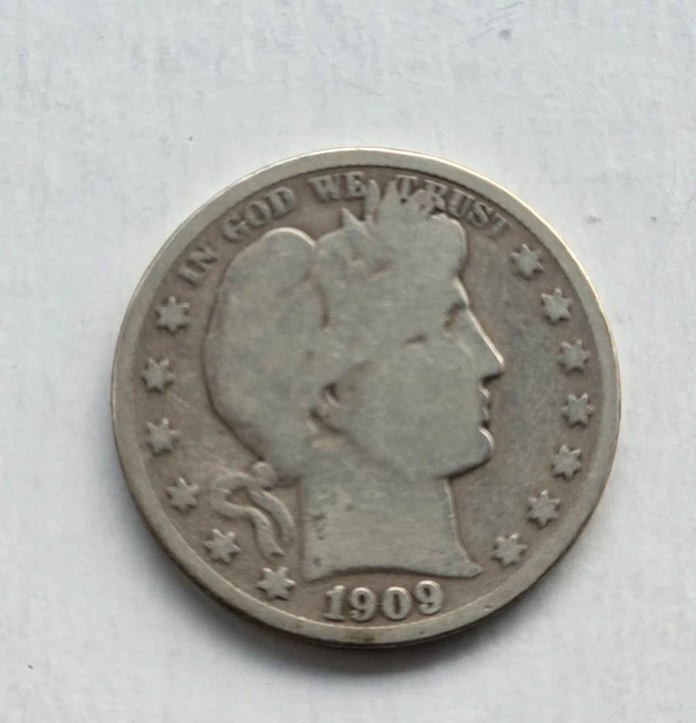 Selling a 1909 s Barber Half Dollar coin. It has some wear, as expected for its age, but the details are still visible. A nice piece for any coin collector!