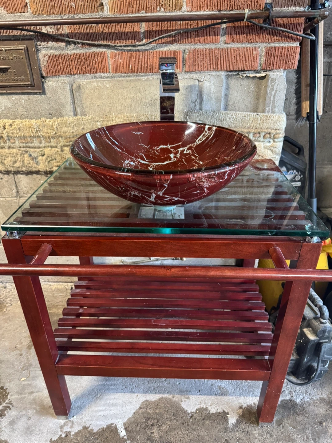 Modern glass-top vanity with a beautiful marble-style vessel sink. Sturdy wooden base with lower shelf for storage. Clean, stylish, and perfect for bathrooms, studios, or renovation projects.