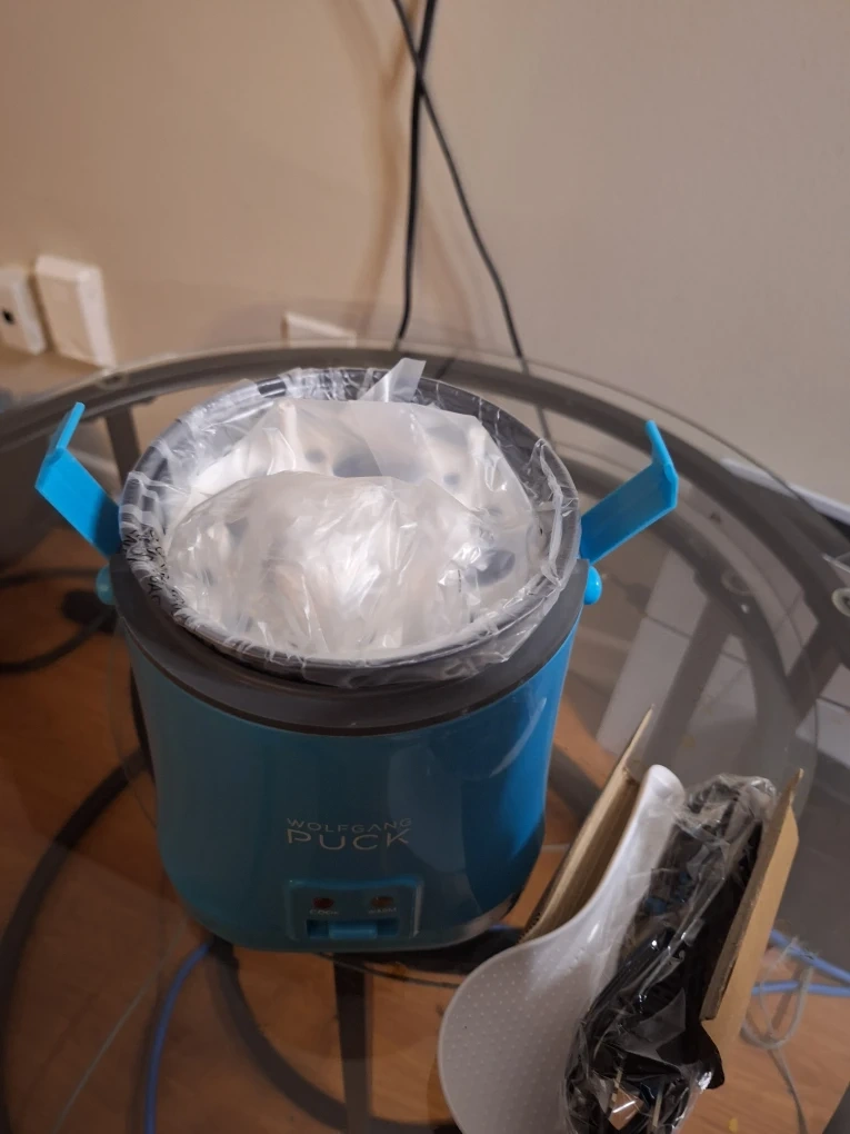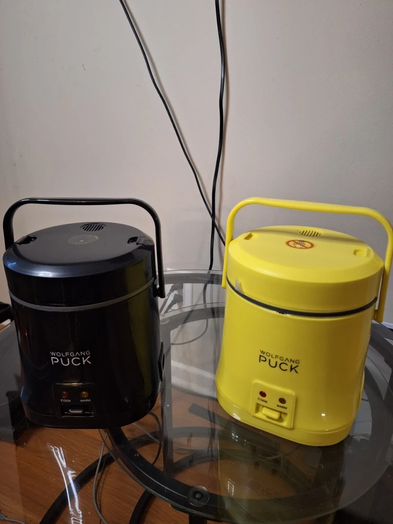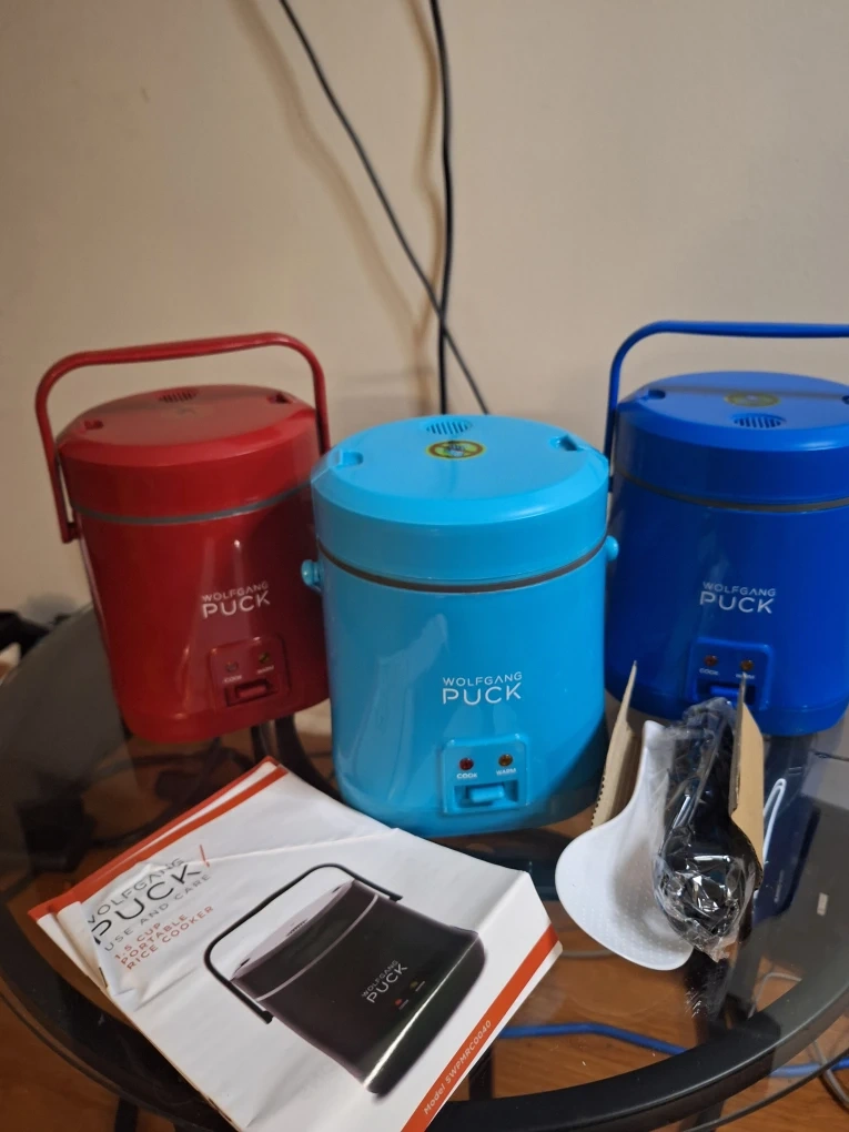 Brand new! Mini rice cooker by Wolfgang Puck. Great for 1-2 people (1.5 cup container). Very portable! Cooks rice in 15-20 minutes. Available in red [3 left], blue [2 dark blue, and 3 light blue left] black [1 left], and yellow [1 left]. Includes accessories. 1 for $20, 2 for $30, 3 for $50, and 4 for $60