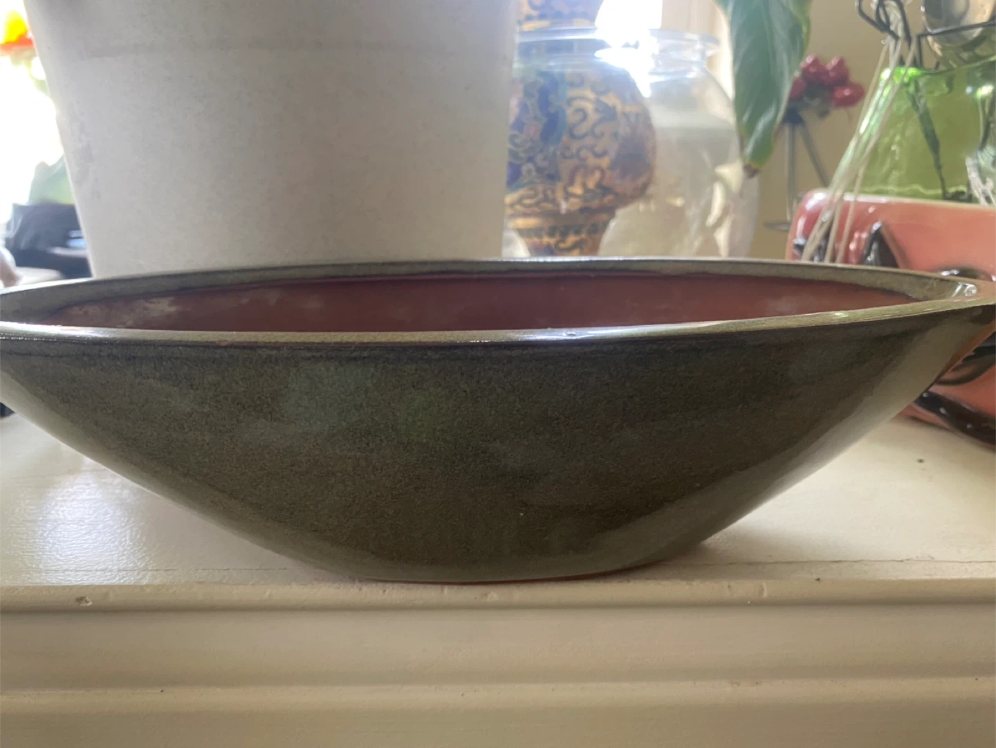 A lovely ceramic bowl with a dark green exterior and a reddish-brown interior. It's perfect for serving or as a decorative piece.