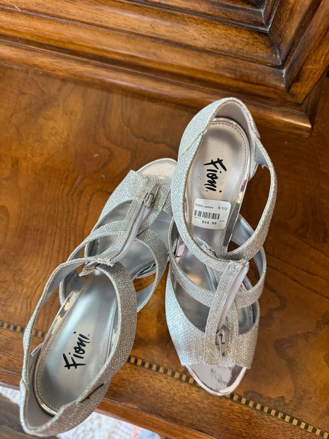 Sparkly Fioni heels with a silver glitter finish. These open-toe sandals feature a zip-up front and a metallic heel. Size is 9 1/2.