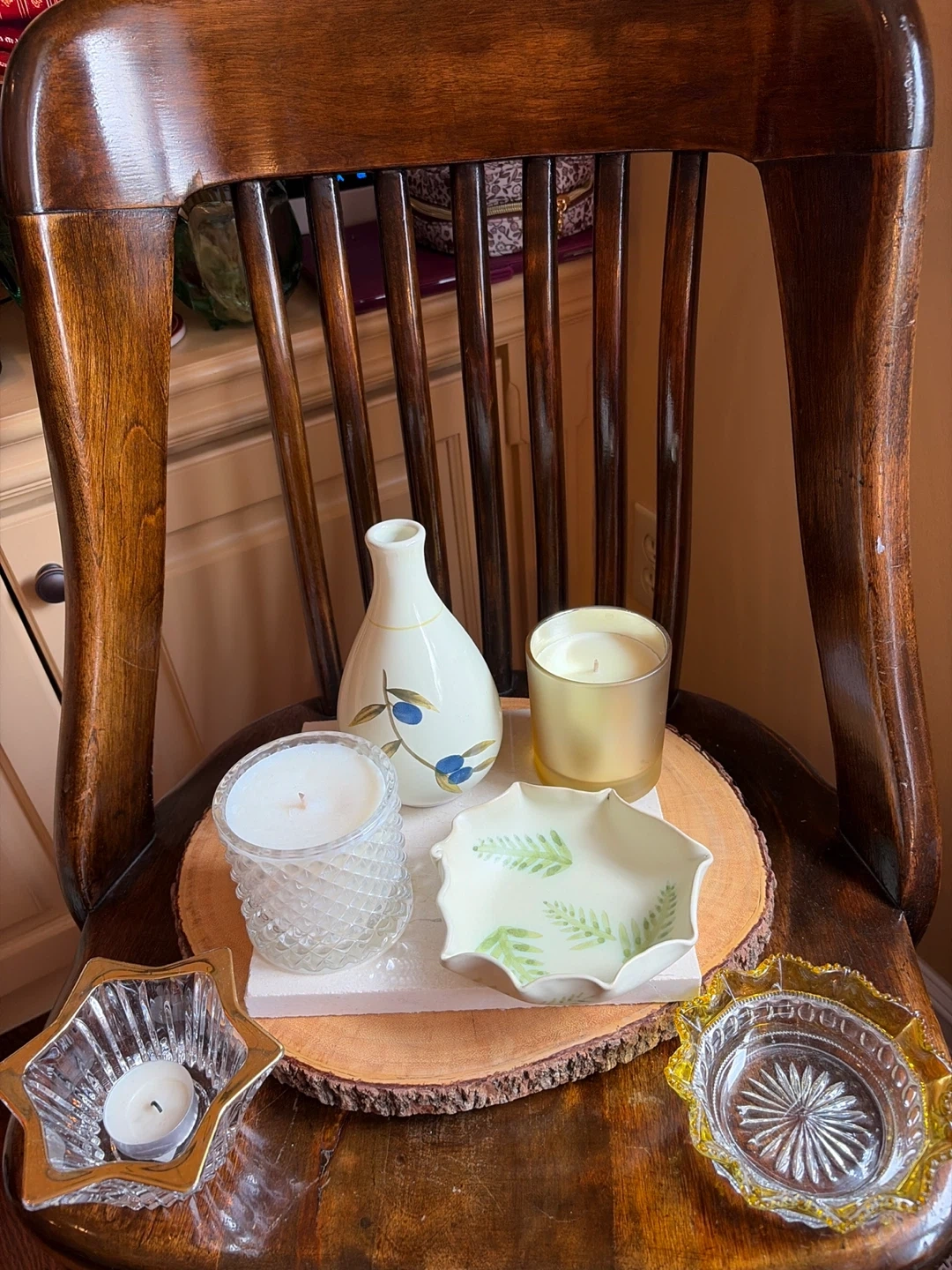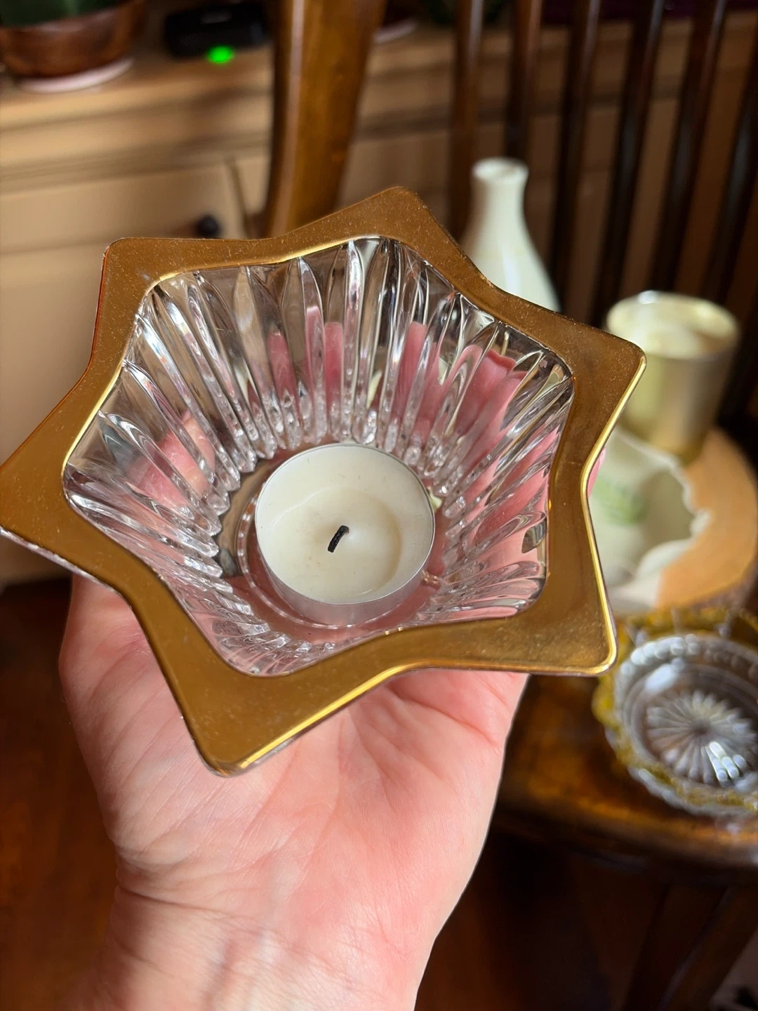#6 is a Jozalle white candle in a pretty glass diamond patterned votive in scent Verdant $5