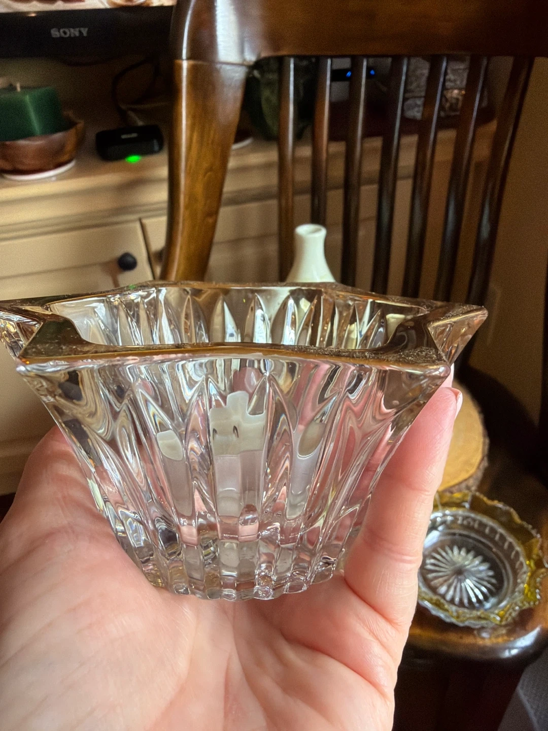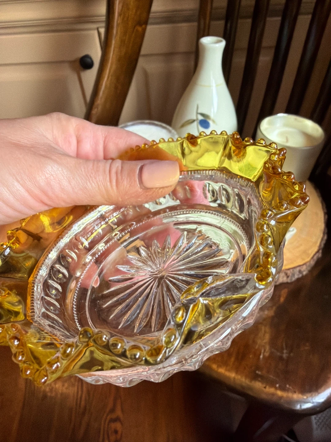 #5 Yellow and Clear Glass Trinket Dish (one small flea bite and 4.5” wide) for $5
