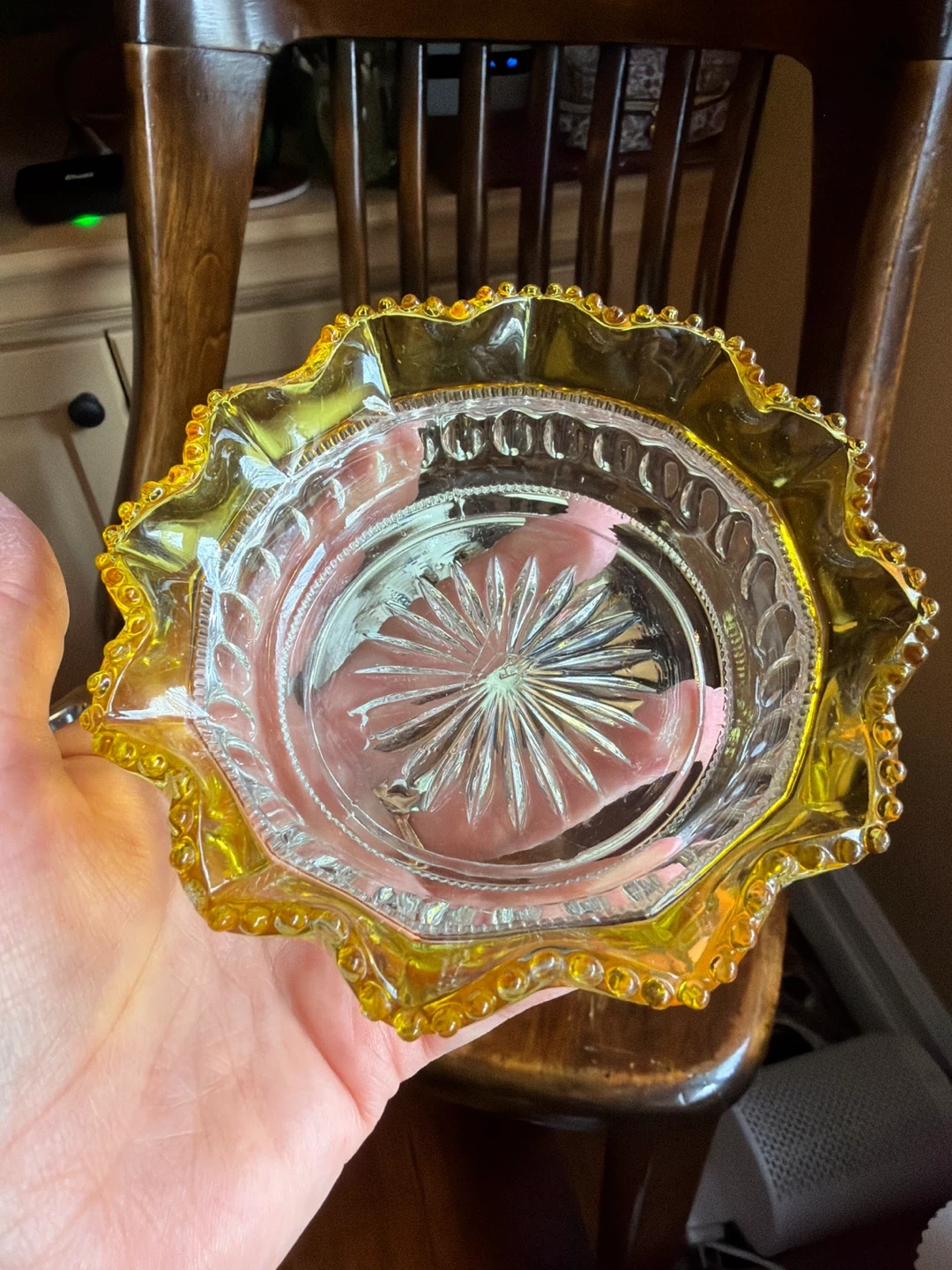 #5 Yellow and Clear Glass Trinket Dish (one small flea bite and 4.5” wide) for $5