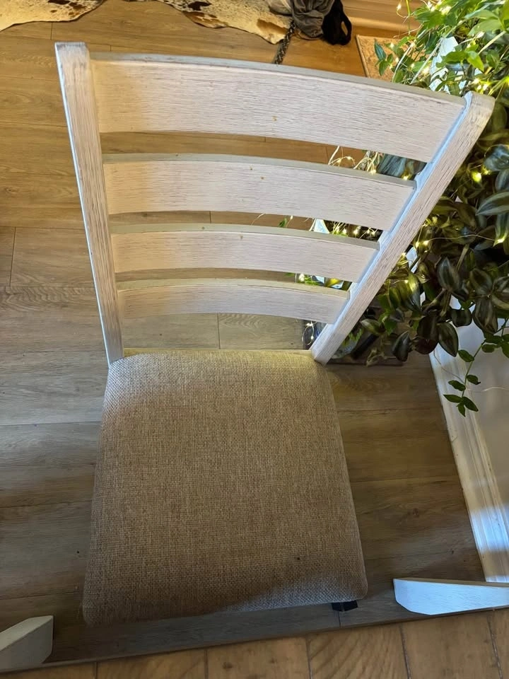 Beautiful farmhouse-style dining set in great condition. Includes a solid wood table, 4 cushioned chairs, and a long bench.
