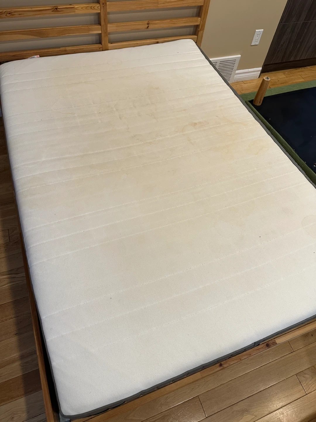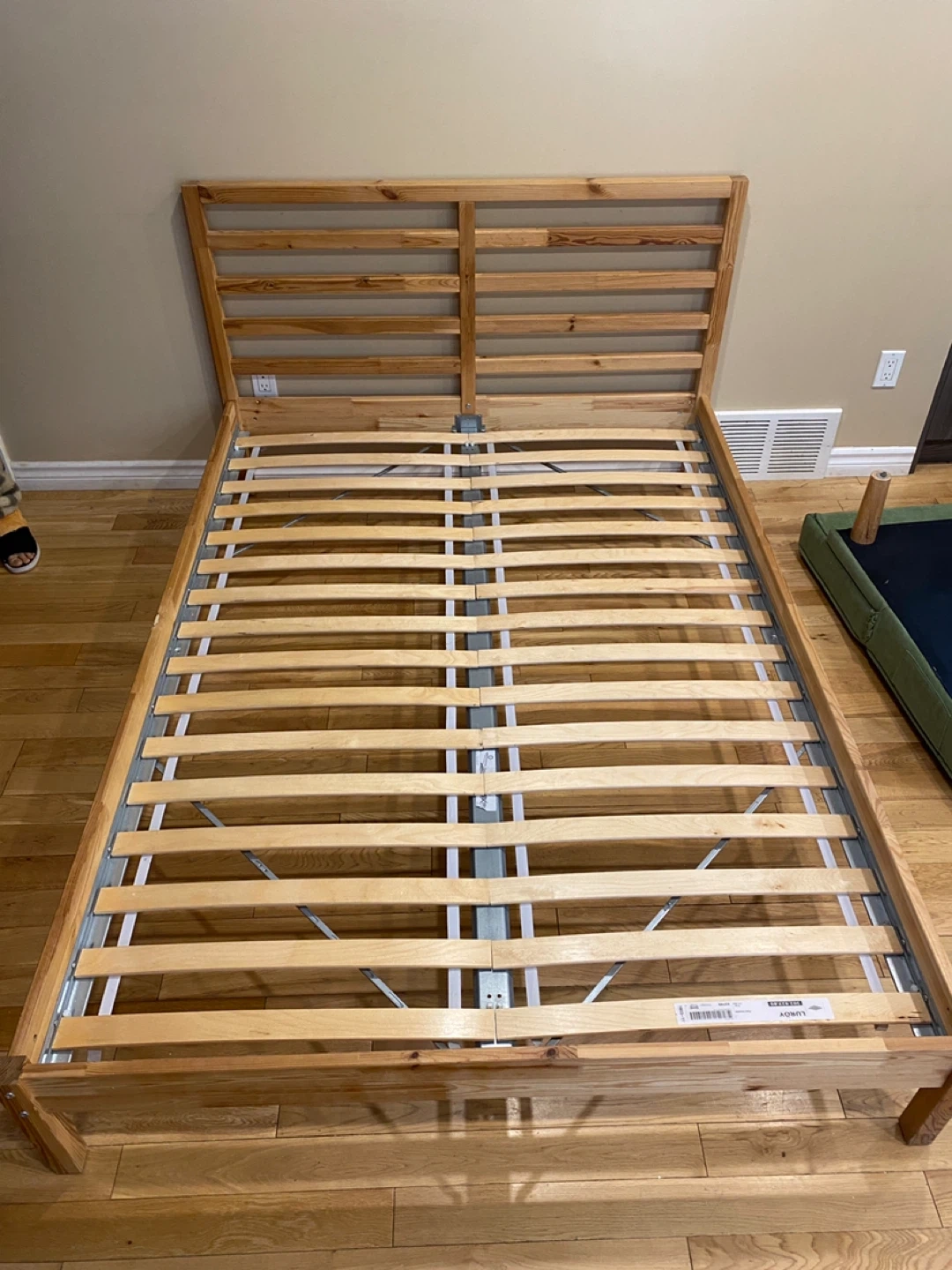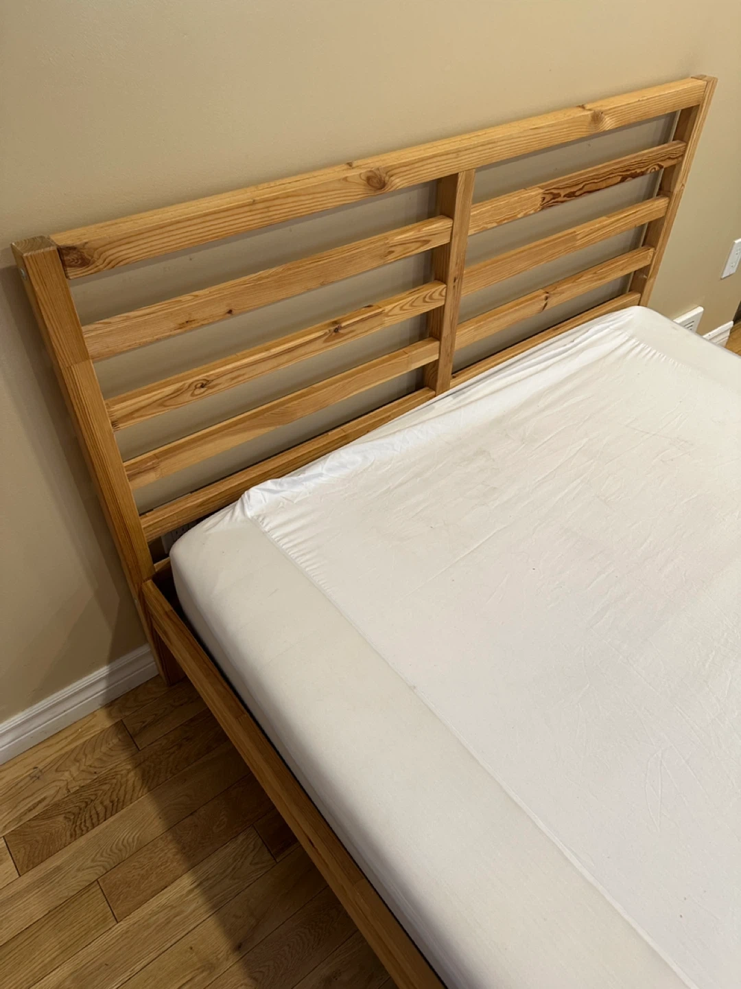 Selling an IKEA TARVA full-size solid wood bed frame in good condition. Nothing is broken, no cracks, and all hardware is included โ€” ready to assemble. ๐ŸŒŸCAN DELIVER FOR SMALL FEE๐ŸŒŸ PRICE: $150 Optional: I can include the IKEA Morgedal full-size mattress for free if you want it. It does have stains(LAST PICTURE), so completely optional. Measurements are shown in the second photo. โœ” Solid pine wood โœ” Sturdy and durable โœ” Clean frame (smoke-free, pet-free home)