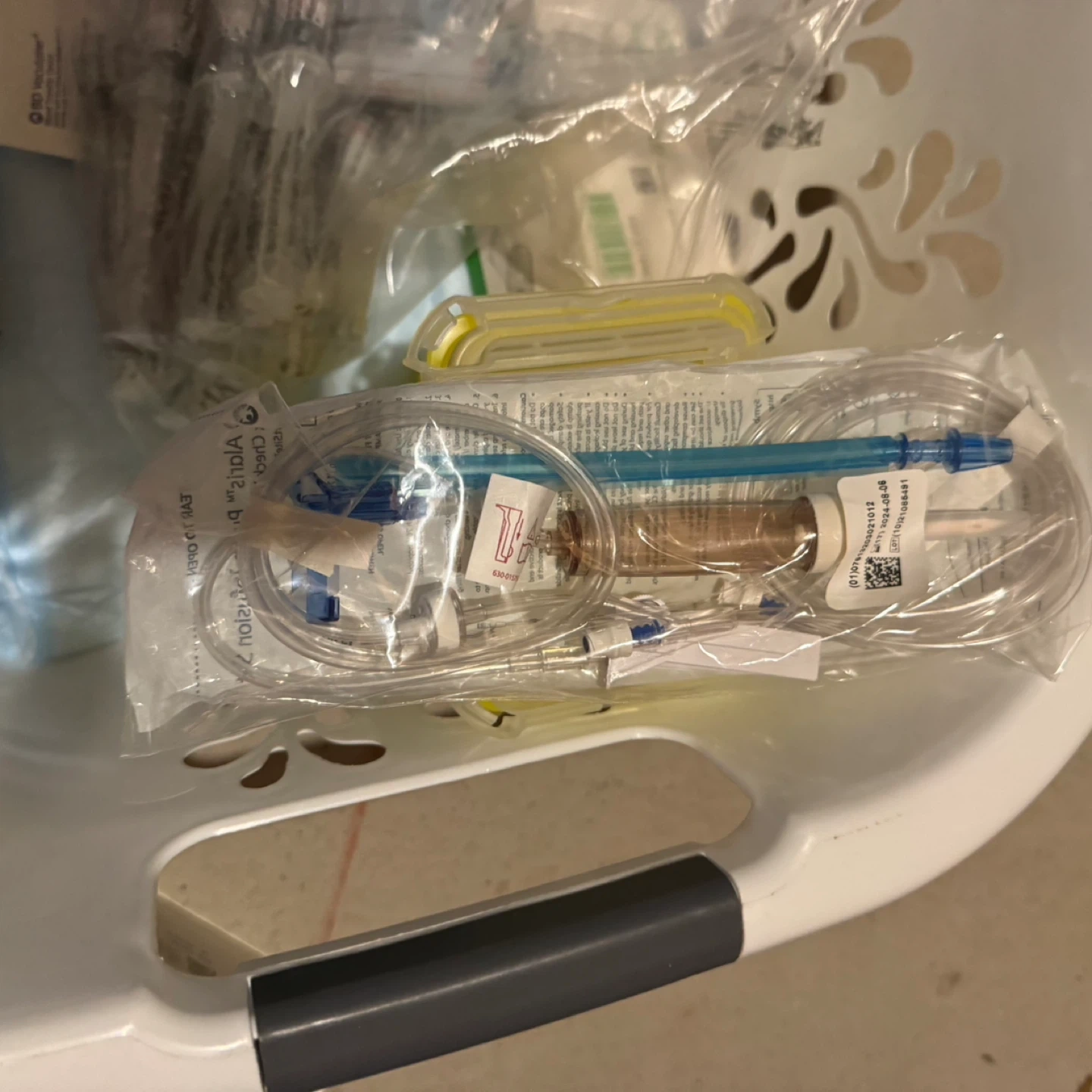 A basket full of healthcare supplies such as dressings, op-sites, Meplex, tapes sterile saline and more. These are all sterile supplies left over from when I was having dressing changes for four months. All the supplies come from a healthcare supply store.