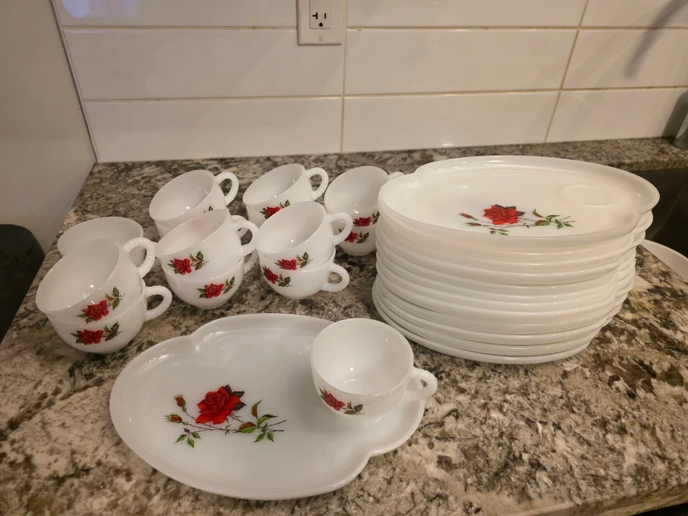 Beautiful vintage white opal tea set with red rose design.