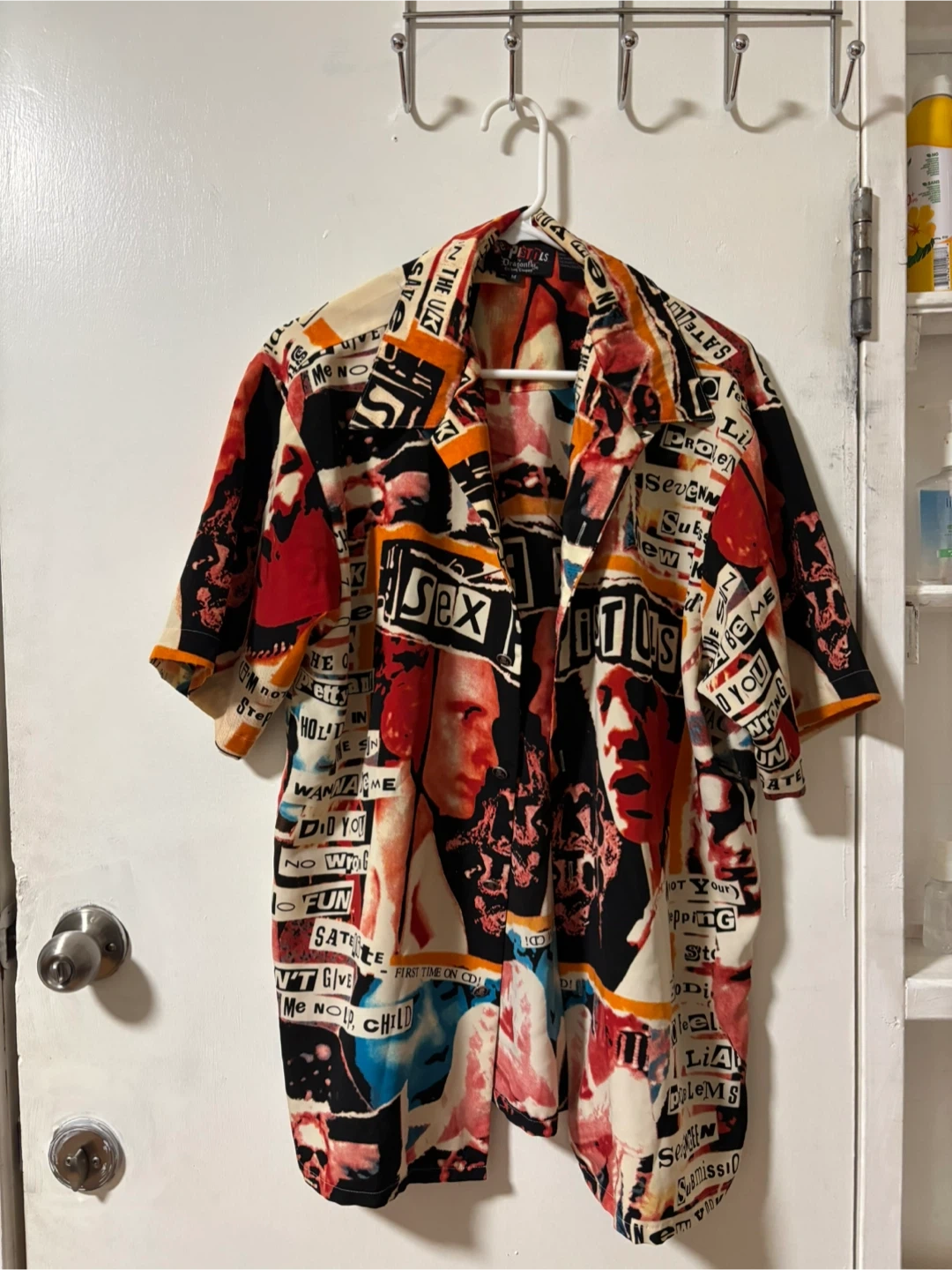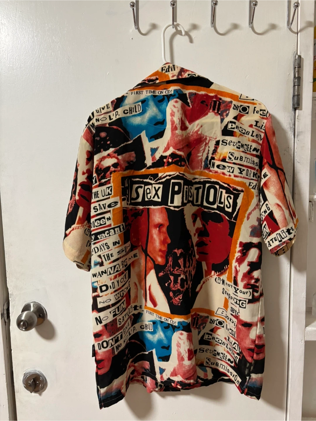 Selling a Sex Pistols button-up shirt. The shirt features a collage of images and text related to the band. Great for fans of punk rock!