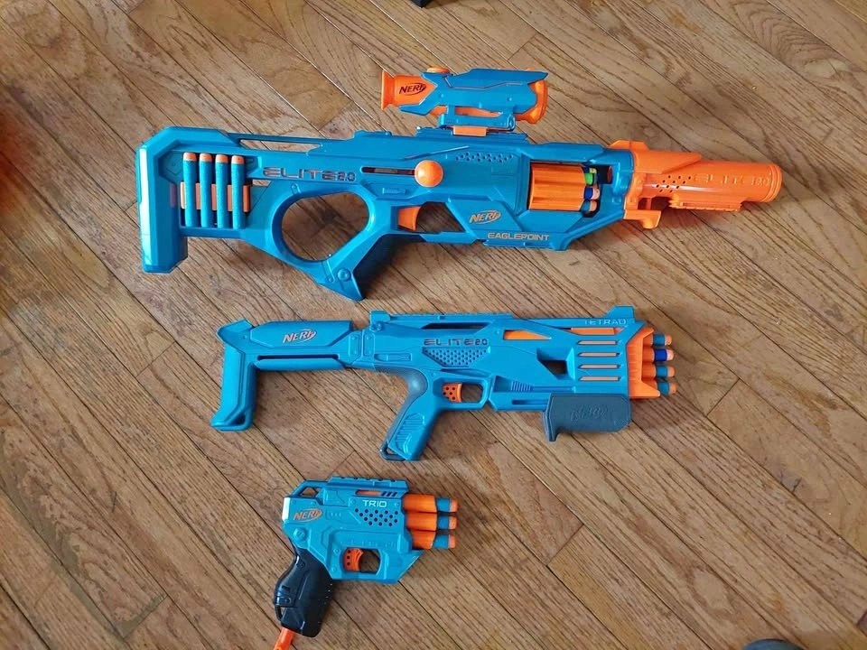 Big box of big and small NERF guns with vest, cartridge, and darts. There are 7 nerf and 2 non-nerf guns, but are compatible with nerf darts. Pick up in Orangeville, Georgetown or Milton only.