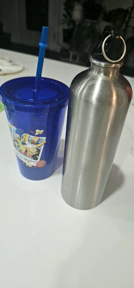 Selling a blue Simpsons Universal Studios cup with a straw, and a stainless steel water bottle. Both are in good condition and ready for a new home