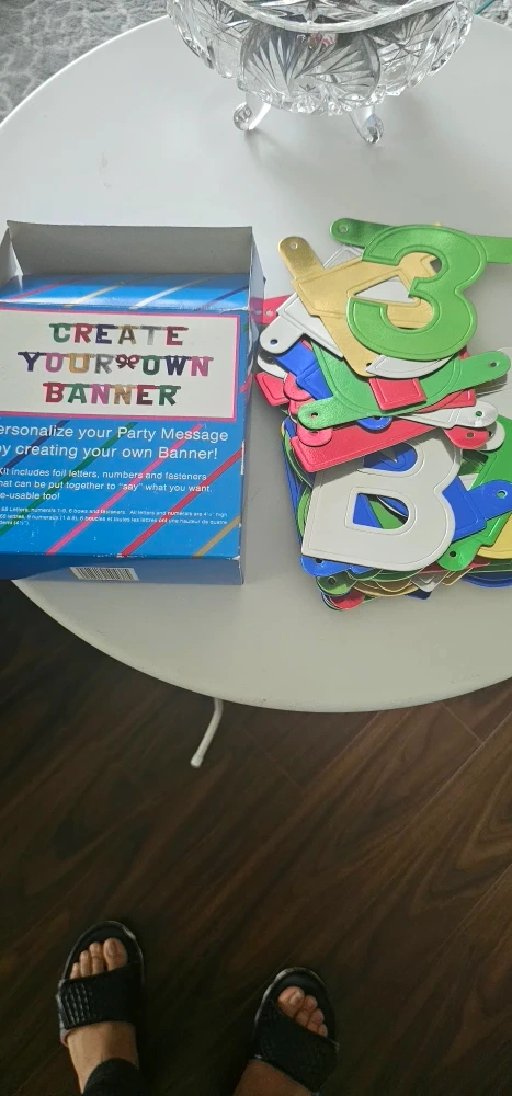 Create your own banner with this fun kit! It includes foil letters, numbers, and fasteners that can be put together to say what you want. It's also re-usable