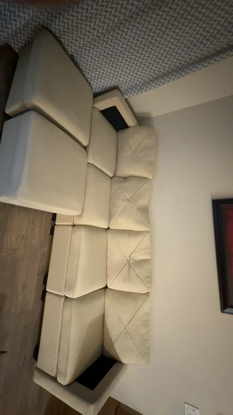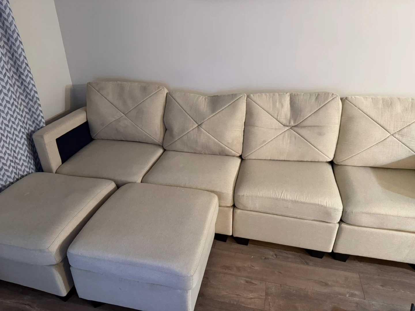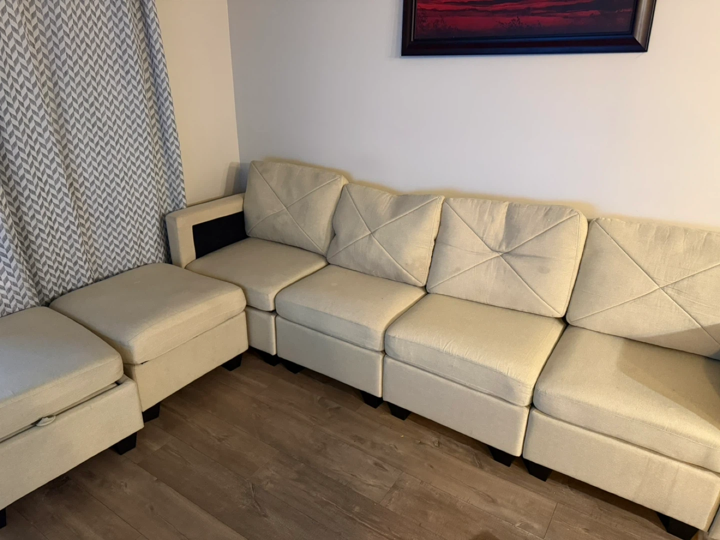 Selling a comfortable modular sectional sofa in a cream colour. It features a versatile design that can be arranged to fit your living space. Perfect for lounging and entertaining!