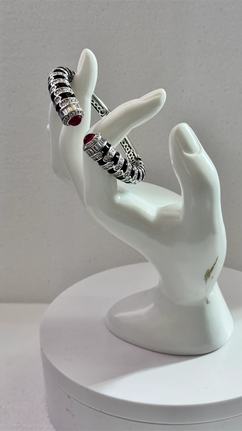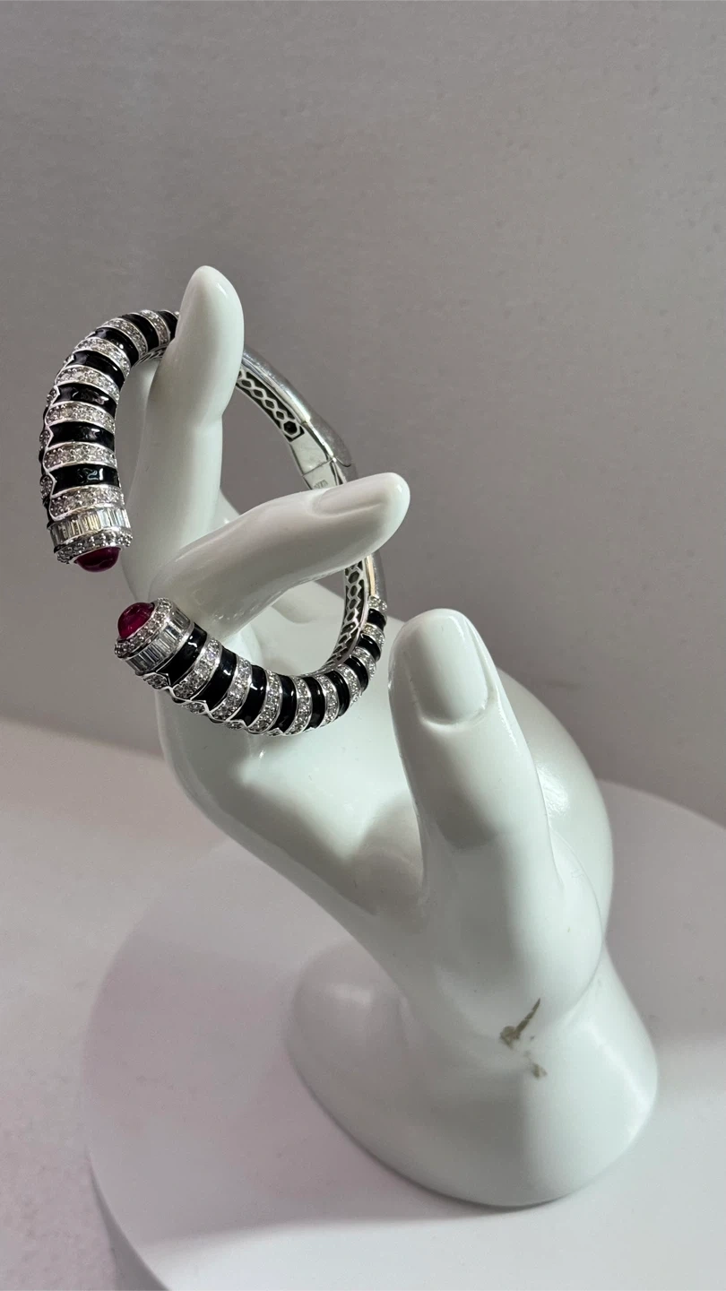 Selling a stylish diamente crystal bracelet with a black and silver design. It features alternating black and silver stripes and some small gemstones Two colours are available green and red