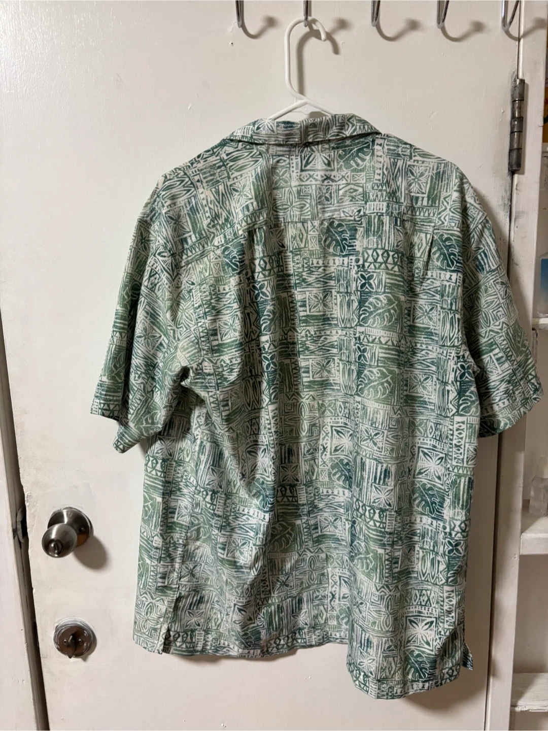 Haggar men's short-sleeved shirt with a green patterned design. It's in great condition and ready for a new home!