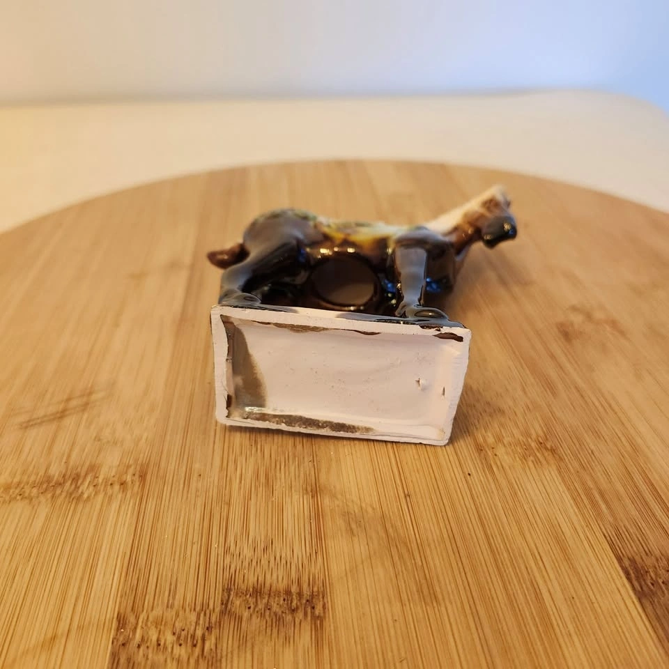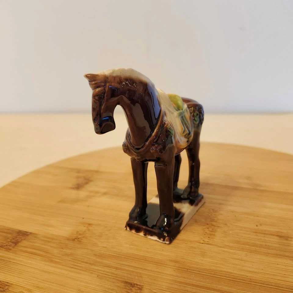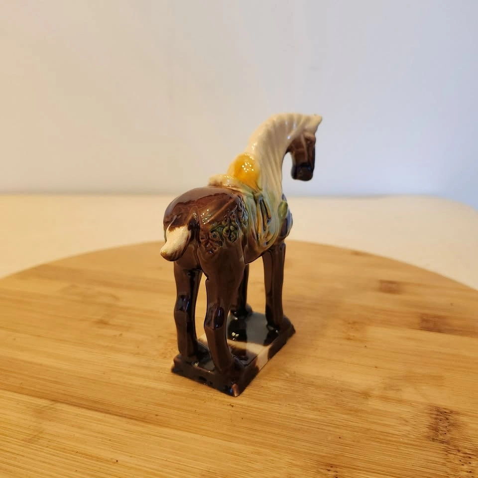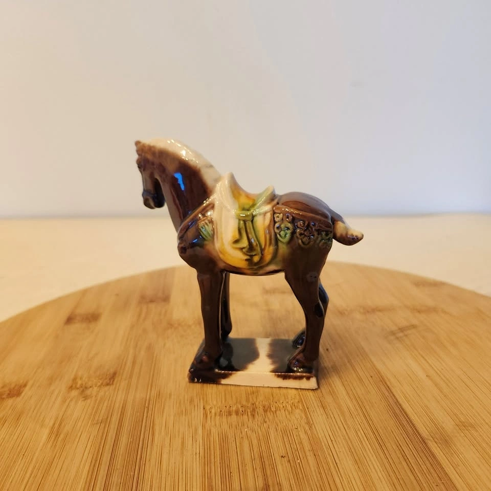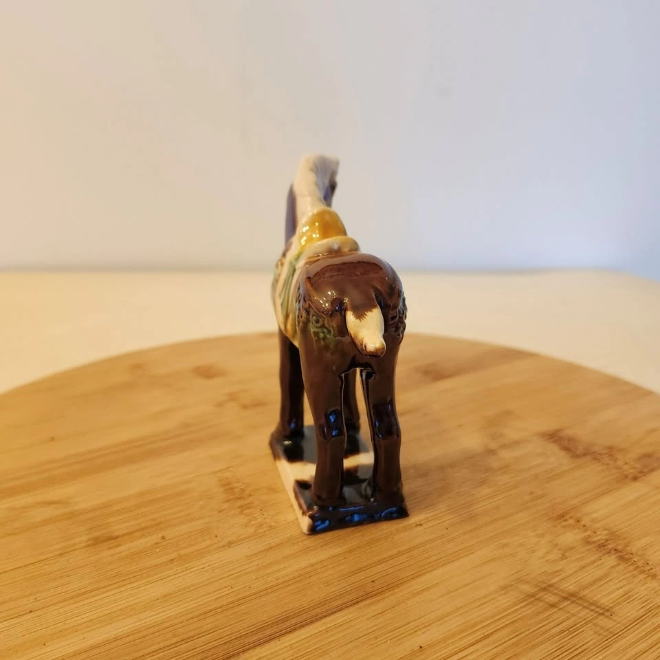 This gorgeous horse, with tri-colored saddle is waiting to add to your decor.